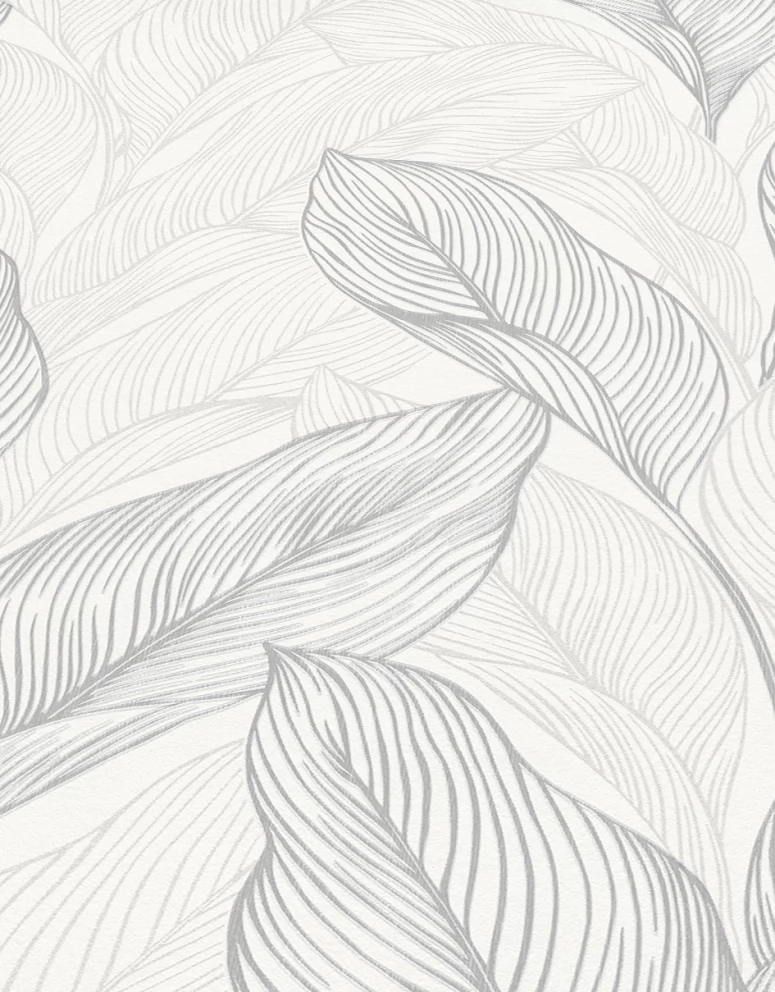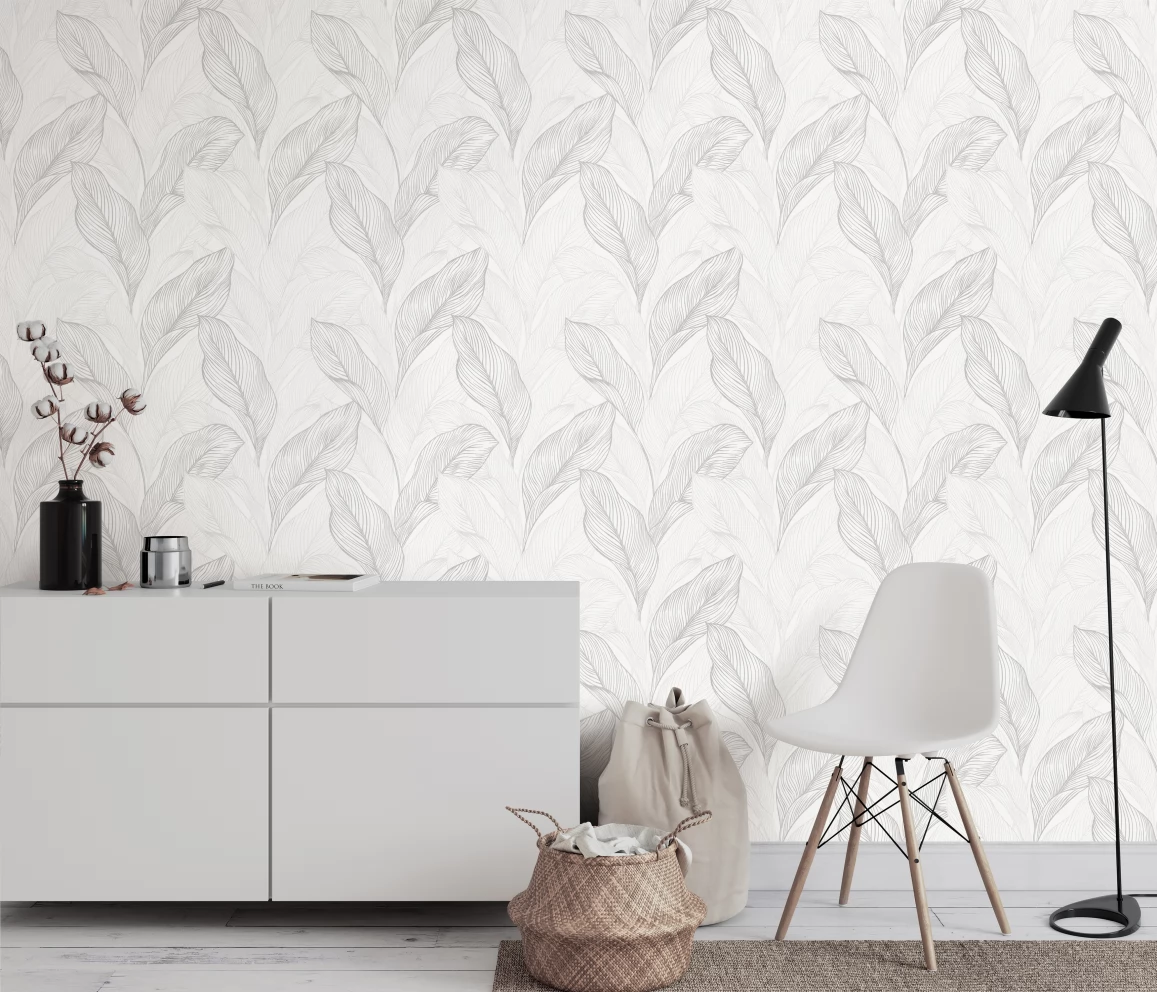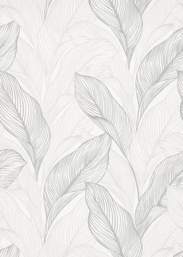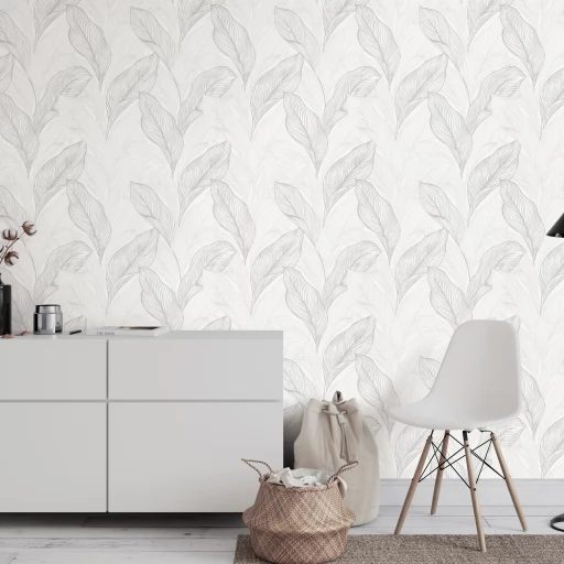 Elegancka tapeta z motywem liści w odcieniach bieli i szarości.