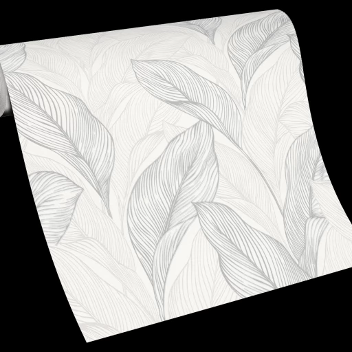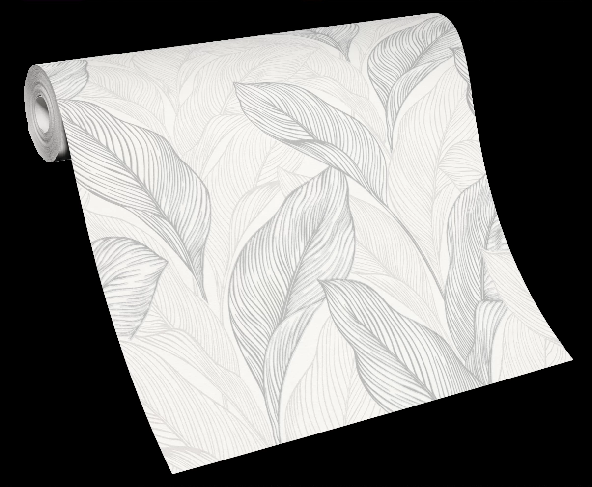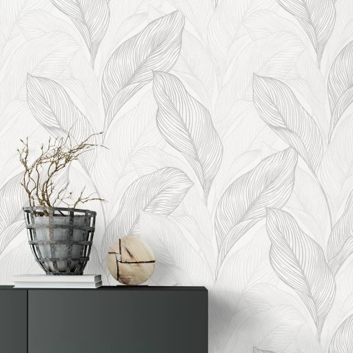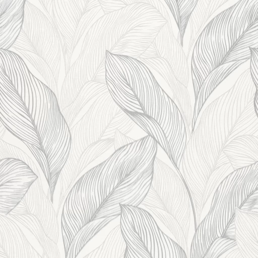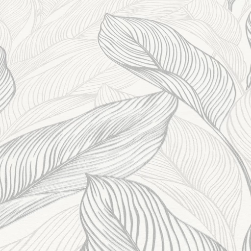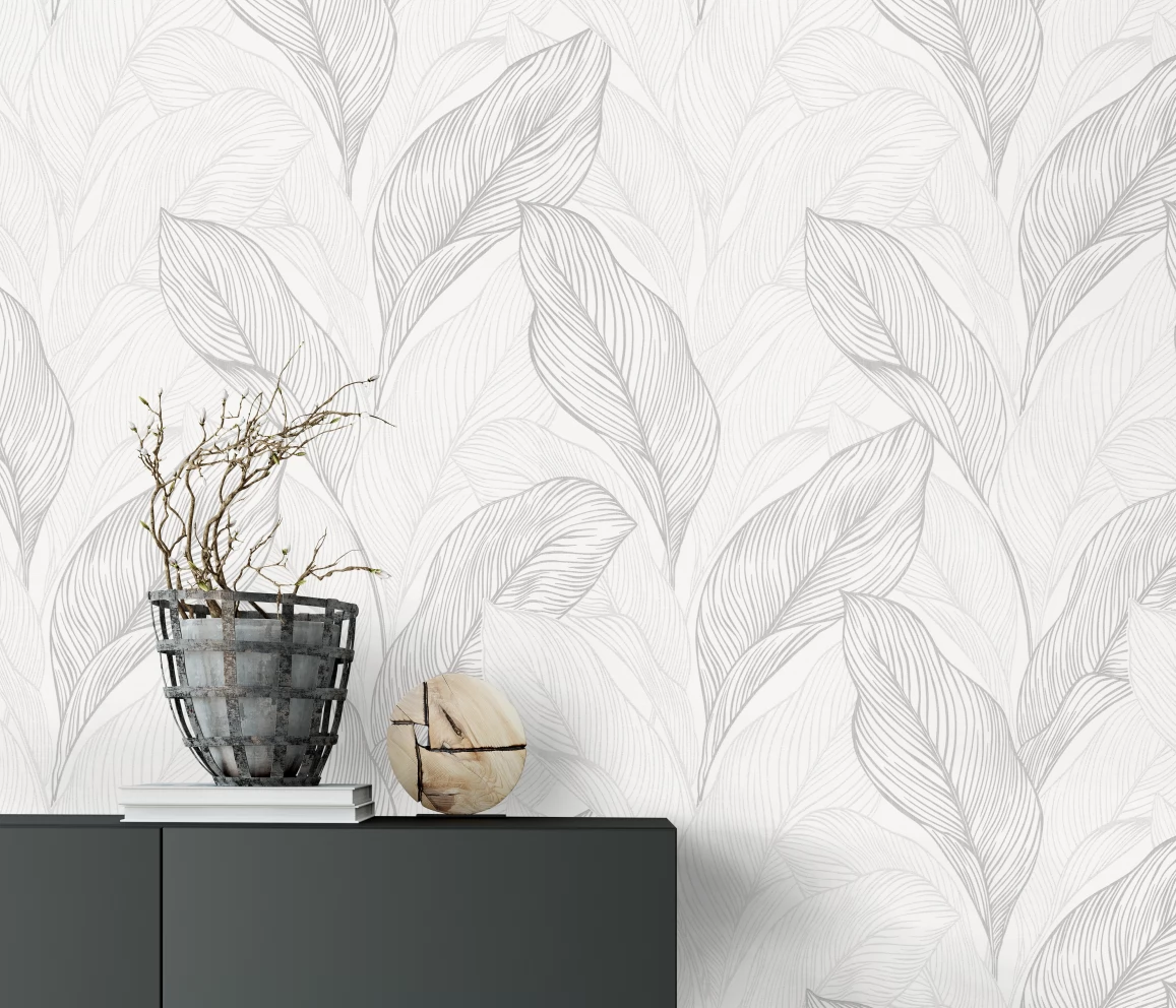 Elegancka tapeta z motywem liści w odcieniach bieli i szarości.