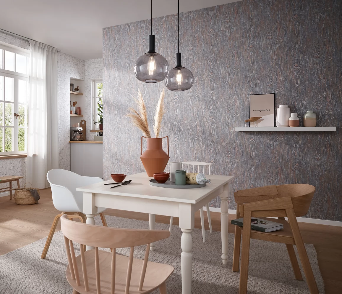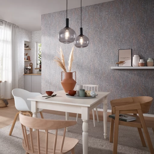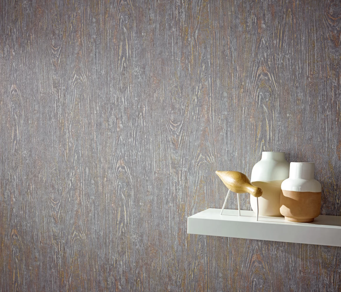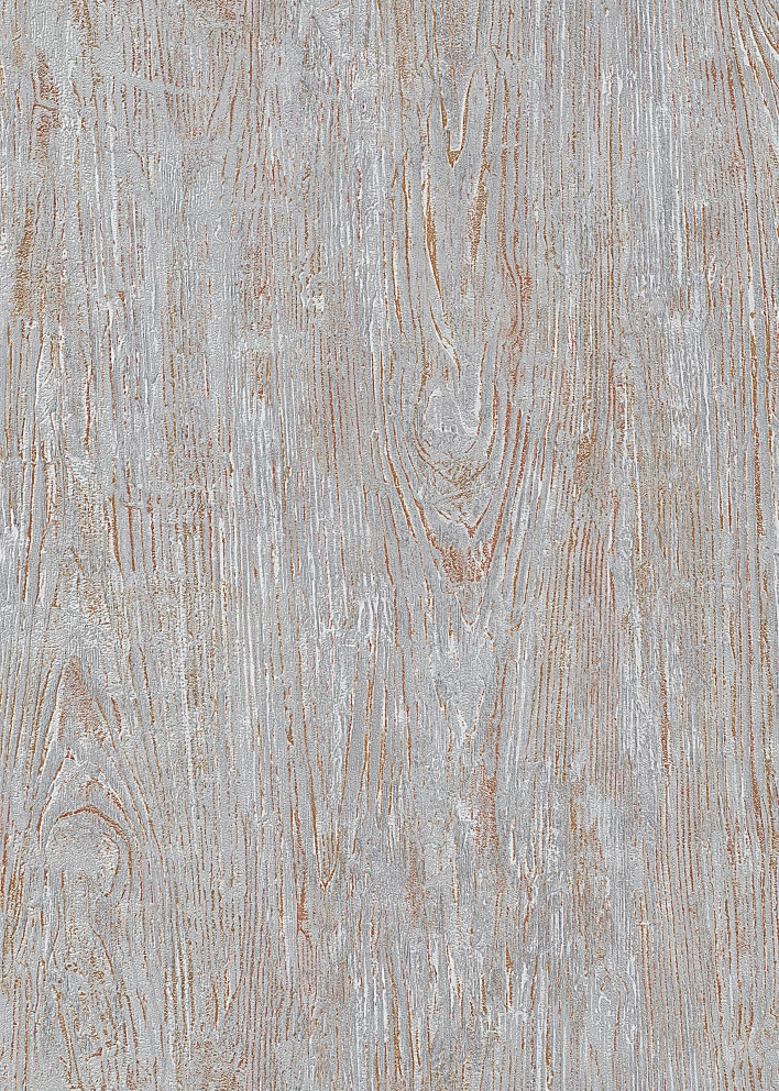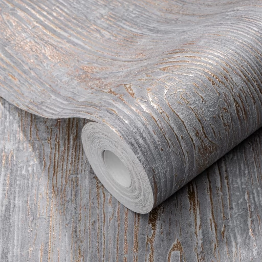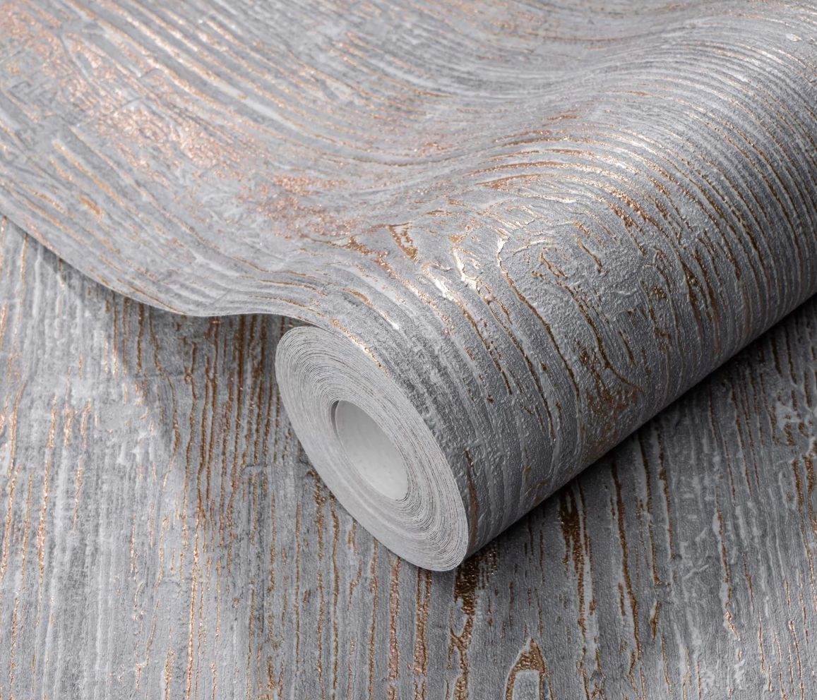 Elegancka tapeta z motywem deski w odcieniu szarości z elementami lśniącej miedzi i złota.