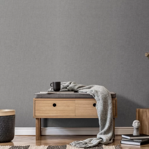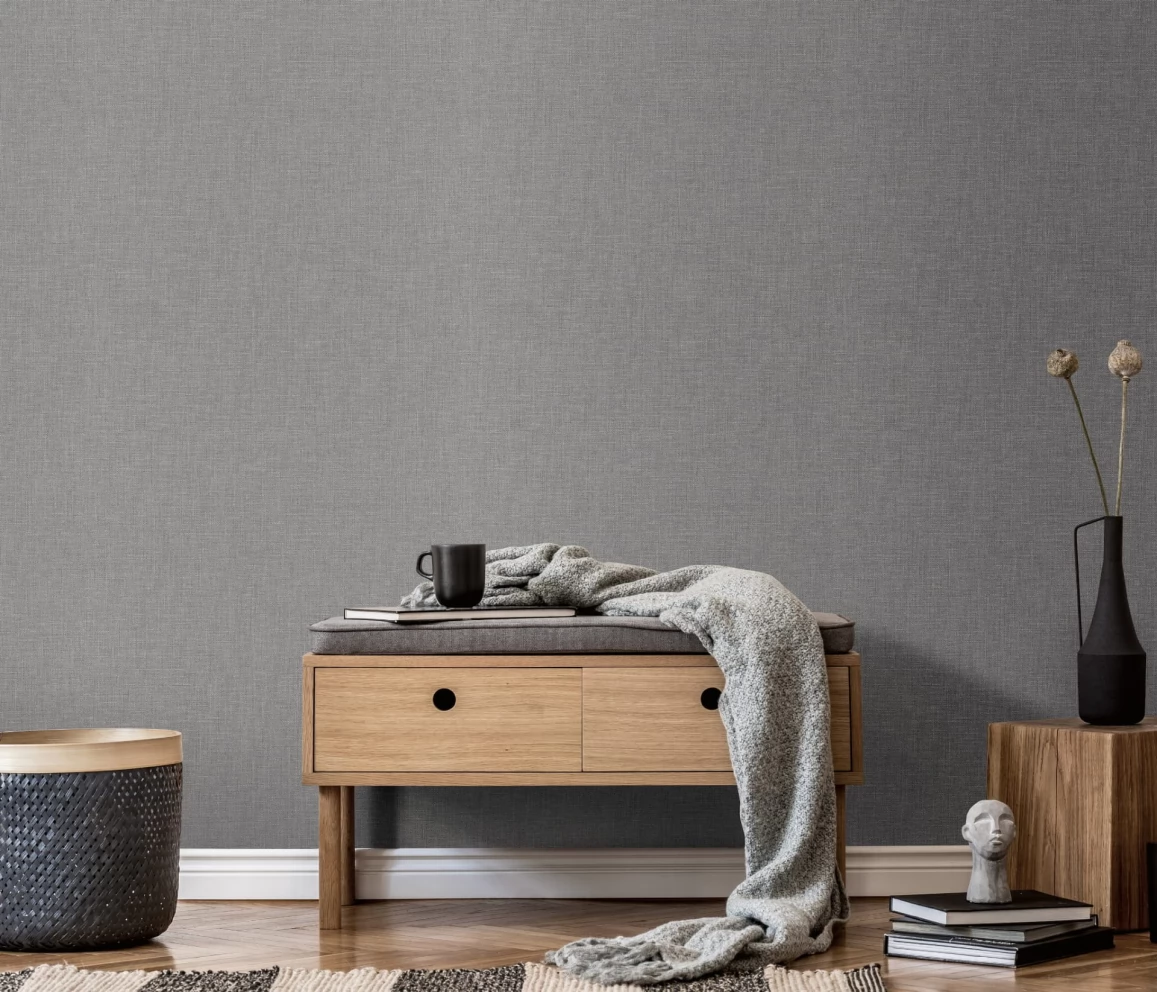 Wysokiej jakości winylowa, zmywalna tapeta na podłożu flizelinowym. Struktura, tkanina, płótno w kolorze szarego melanżu. Matowe wykończenie i wyczuwalna w dotyku struktura.