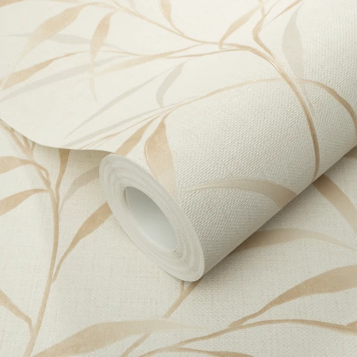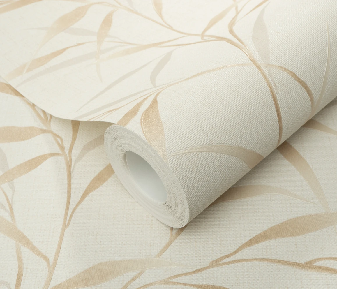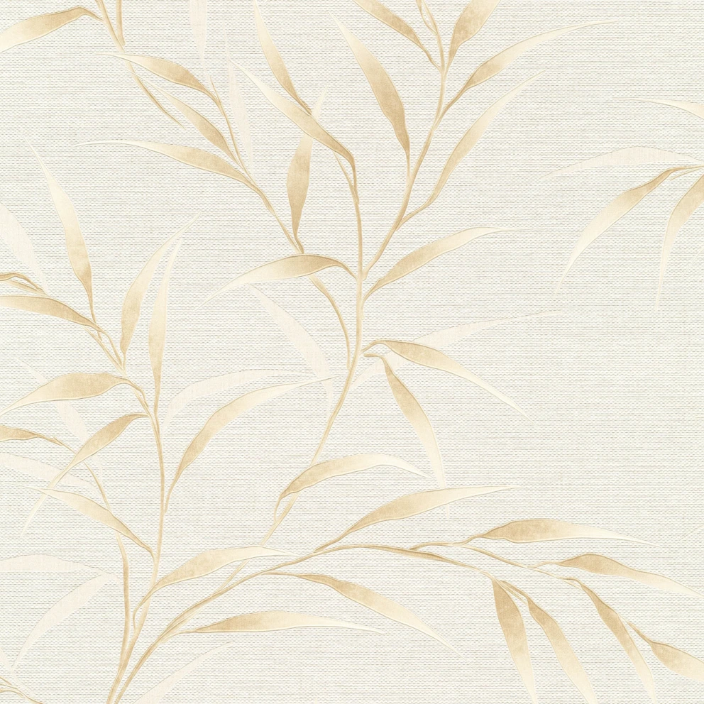 Winylowa, zmywalna tapeta niemieckiej fabryki ERISMANN. Motyw delikatnych listków w odcieniach beżu. Struktura tła w wyglądzie i dotyku przypomina płótno o matowym wykończeniu. Tapeta na flizelinie - klej nakładamy tylko na ścianę.