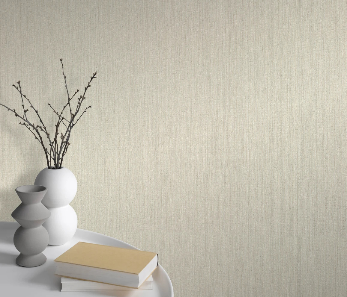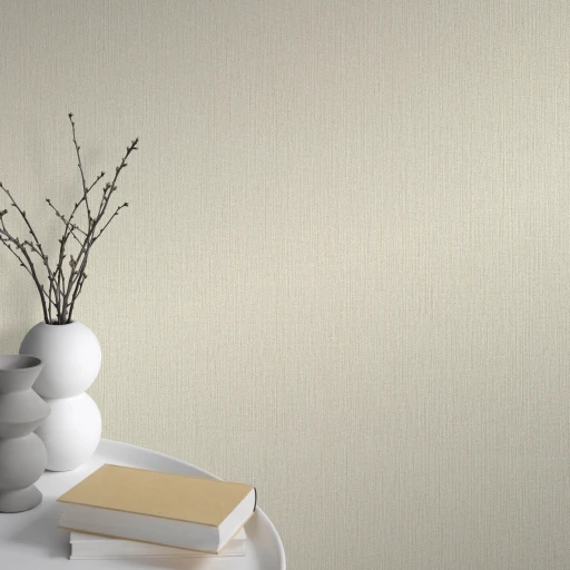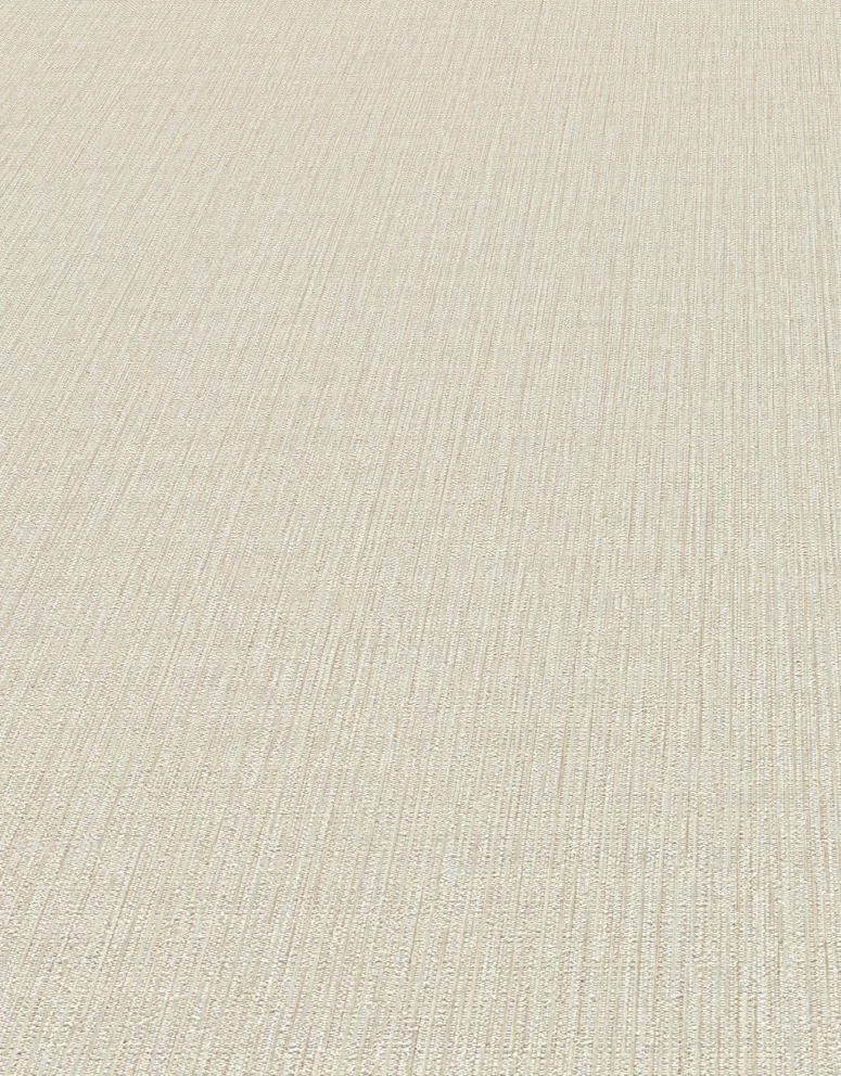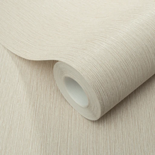 Winylowa tapeta na podłożu flizelinowym. Imitacja tkaniny w pionowe prążki w odcieniach beżu z delikatnym połyskiem.