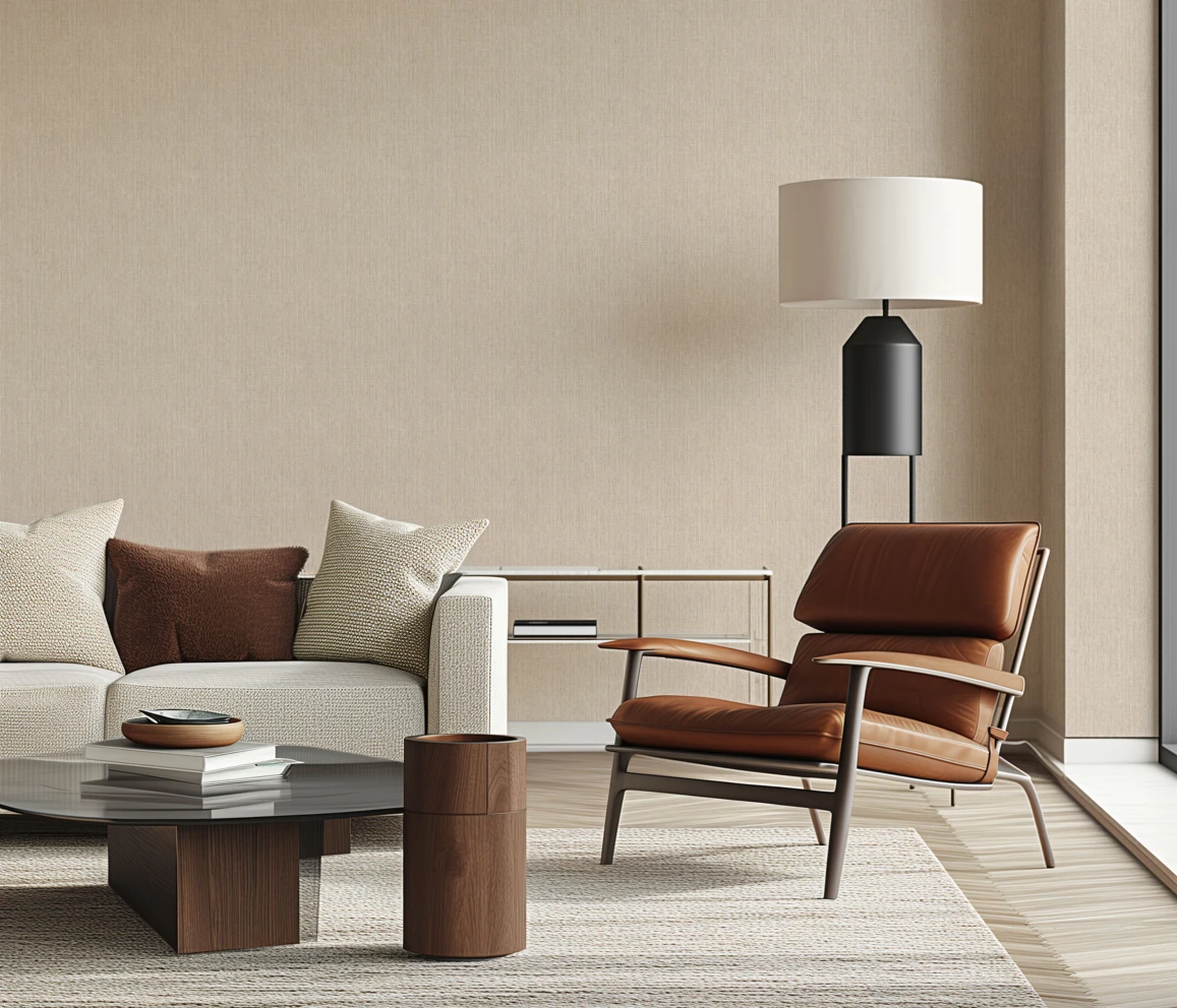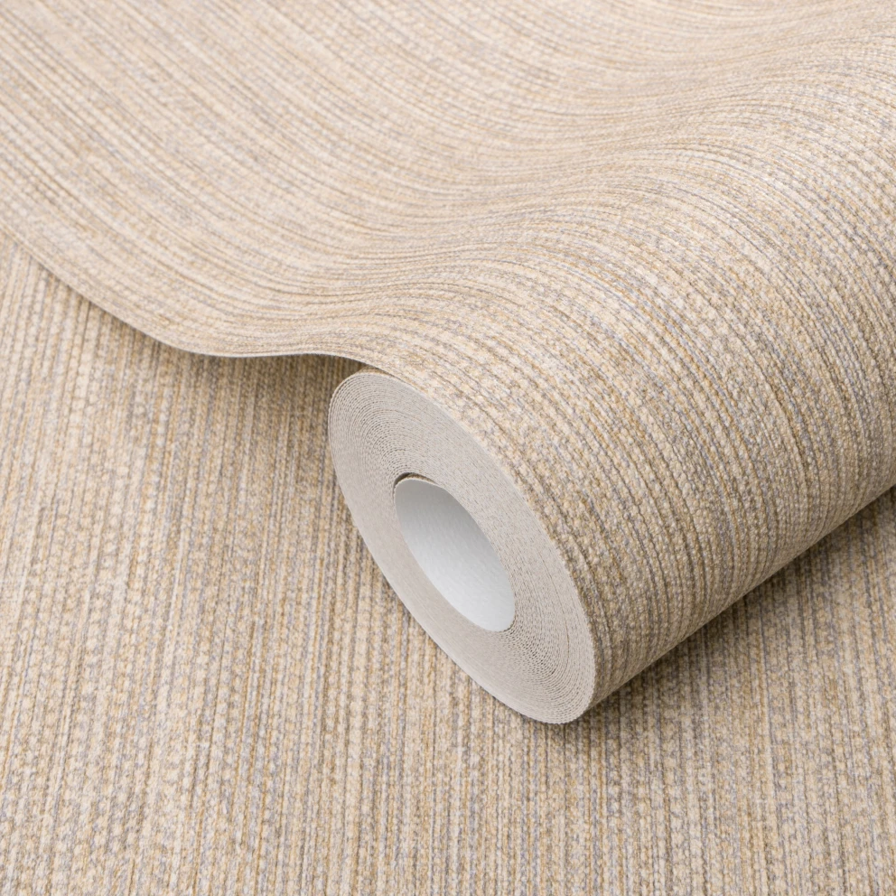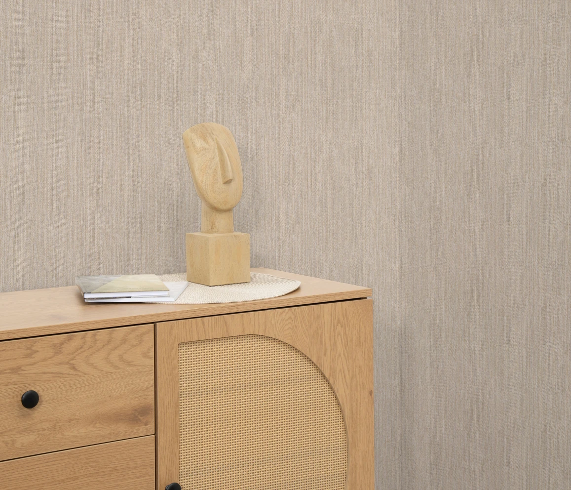 Winylowa tapeta na podłożu flizelinowym. Imitacja płótna w odcieniach brązu i beżu z akcentem fioletowej nitki.