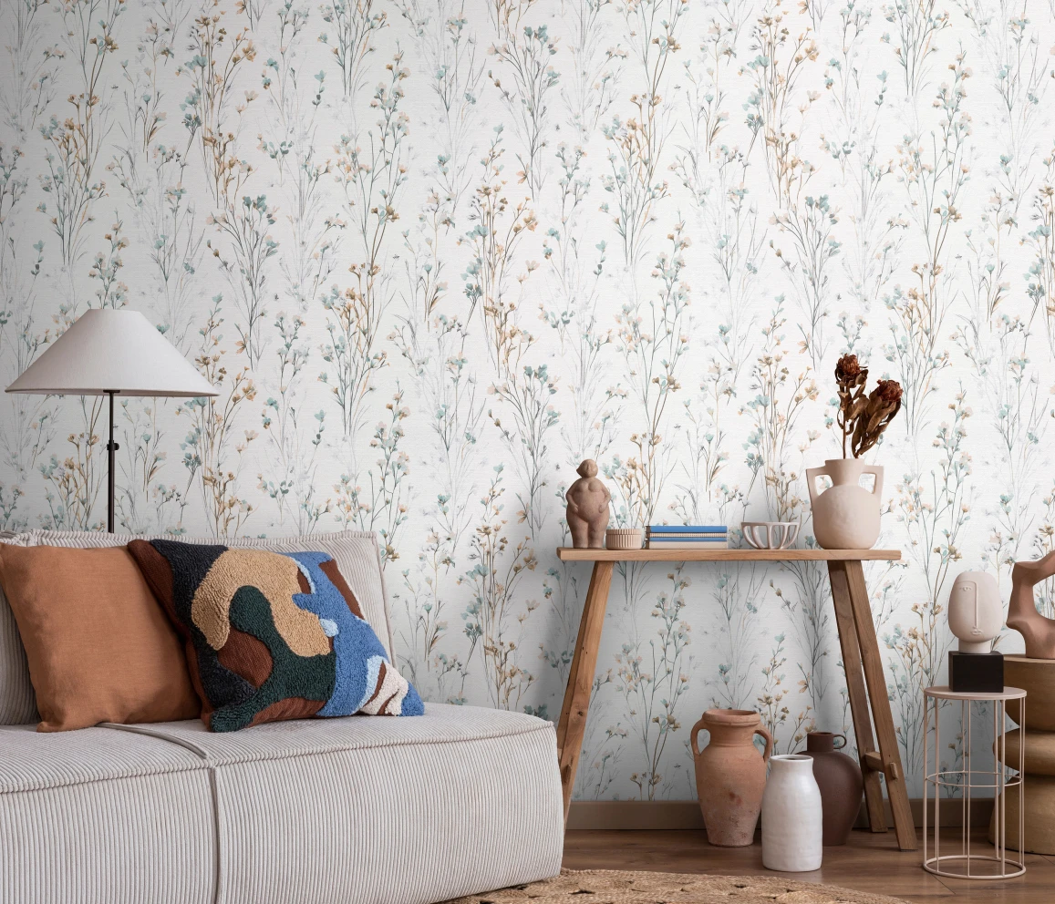 Tapeta niemieckiego producenta ERISMANN. Wzór przedstawiający motyw roślinny w stylu boho. Struktura powierzchni imituje tkaninę.