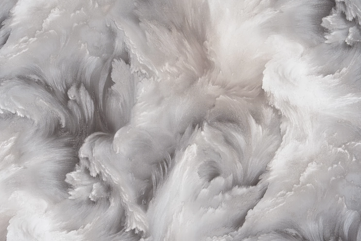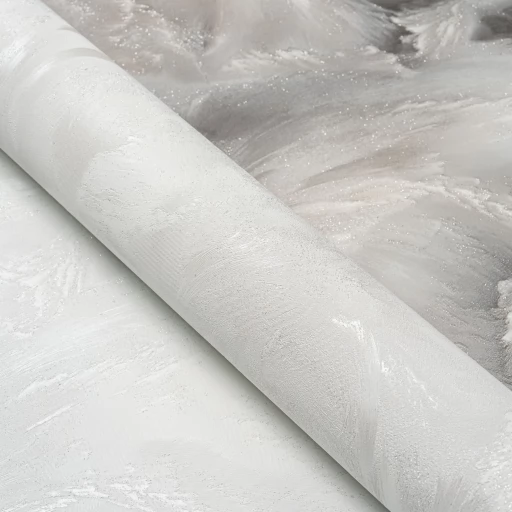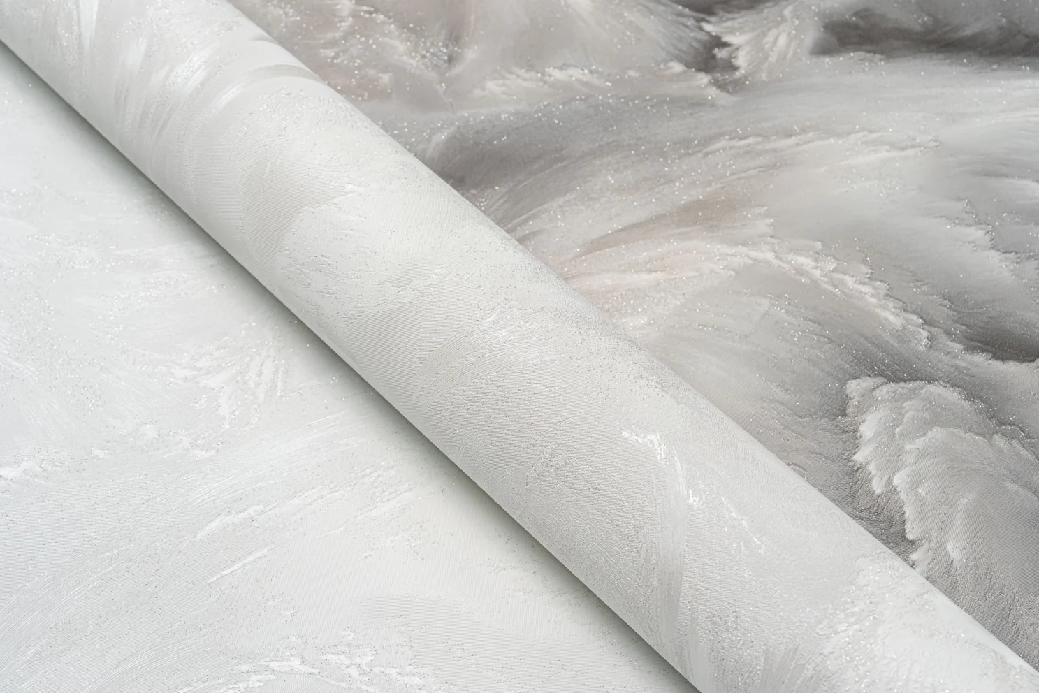 Wysokiej jakości winylowa, zmywalna tapeta. Wzór przedstawiający dekoracyjną abstrakcję przypominającą fale w odcieniach szarości i beżu z połyskującym opalizującym brokatem. Struktura tapety odzwierciedla ułożenie wzoru.