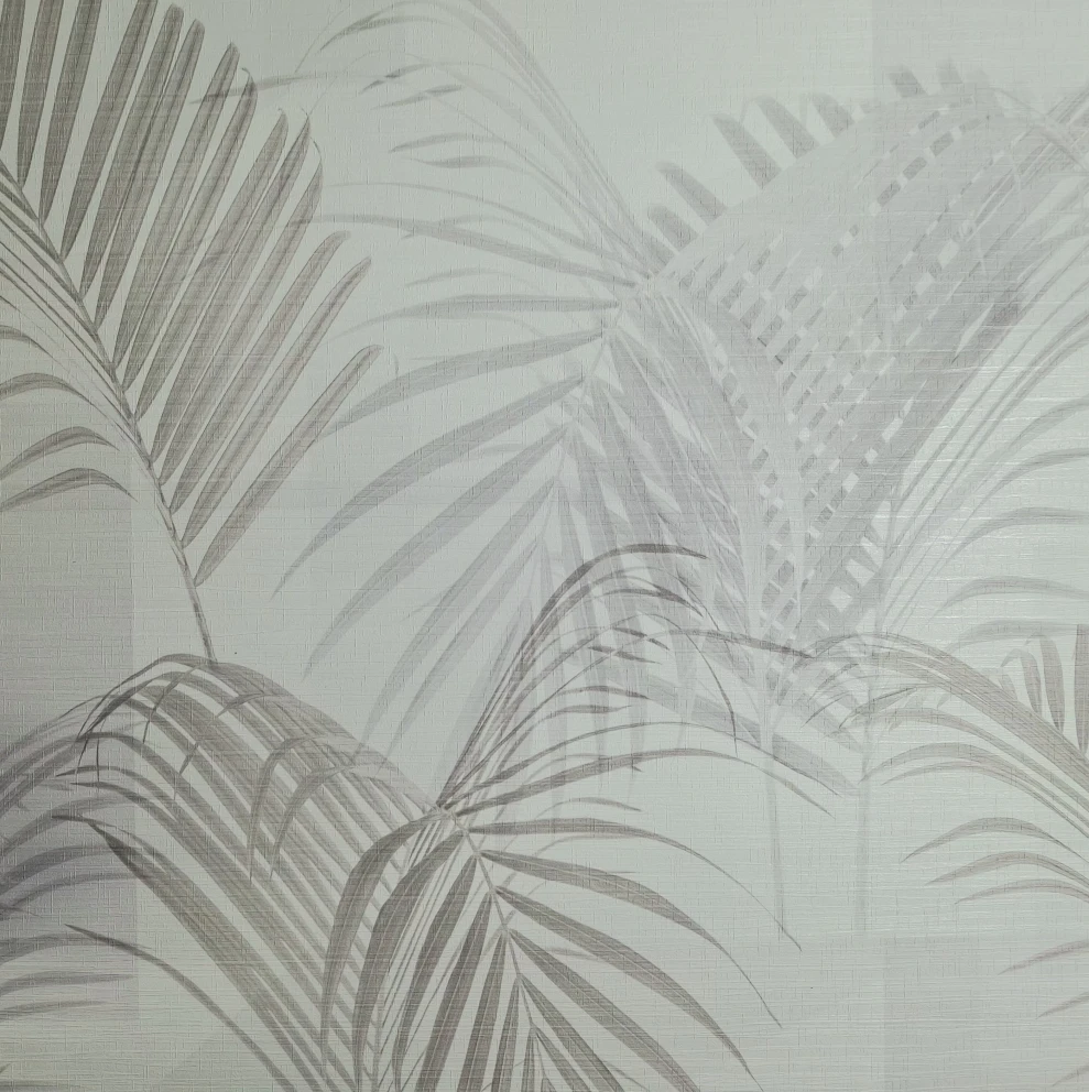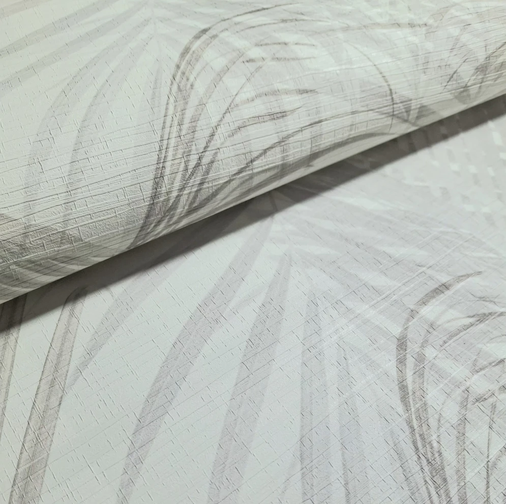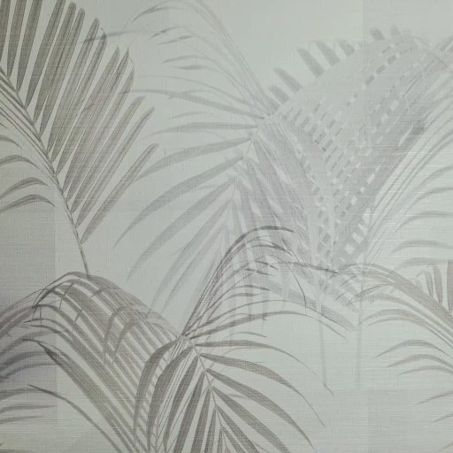 Winylowa, zmywalna tapeta niemieckiego producenta AS CREATION. Estetyczna dekoracja, wzór przedstawiający liście palmy w odcieniach szarości i beżu. Produkt na podłożu z flizeliny.