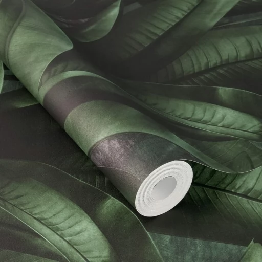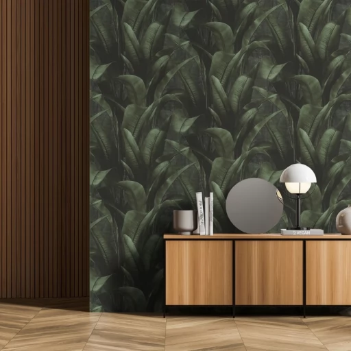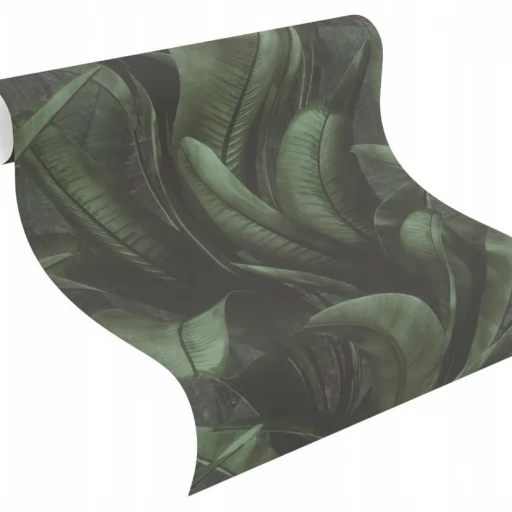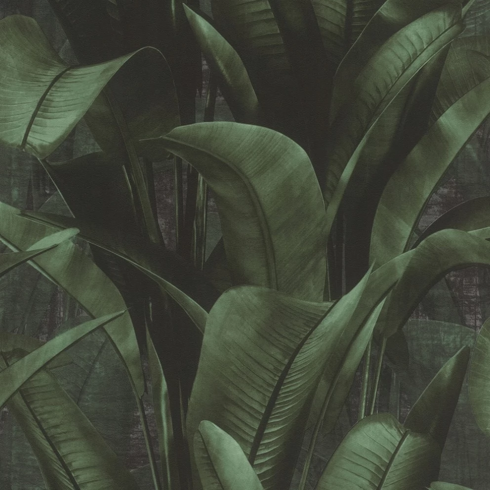 Wysokiej jakości winylowa, zmywalna tapeta  przedstawiająca motyw okazałych liści bananowca na ciemnym tle. Tapeta produkcji niemieckiej fabryki RASCH. Oryginalny produkt.