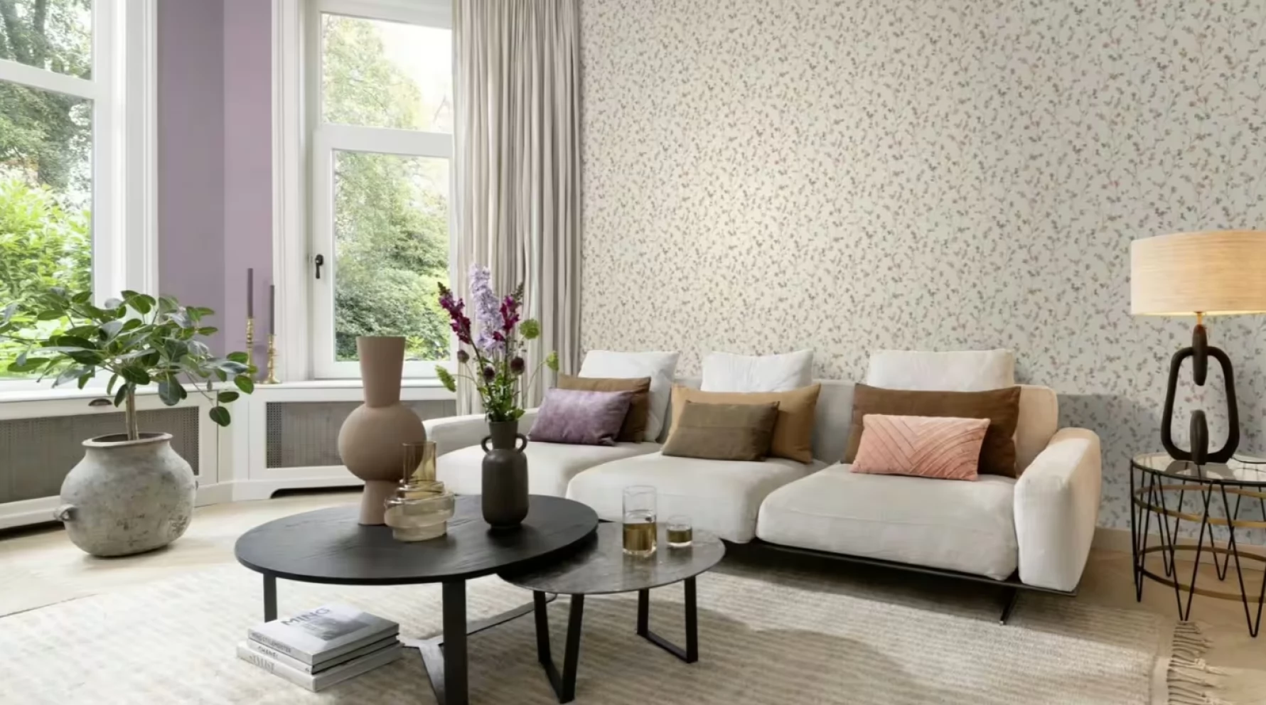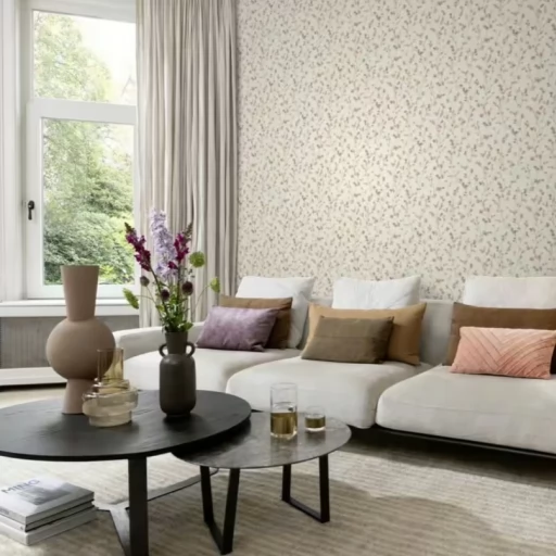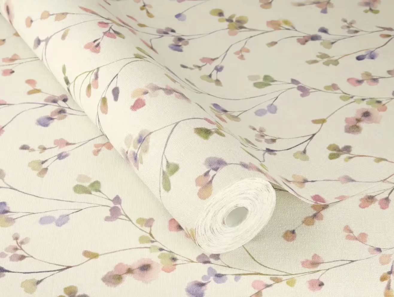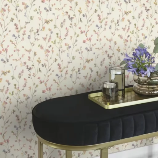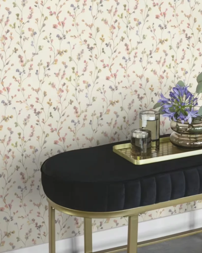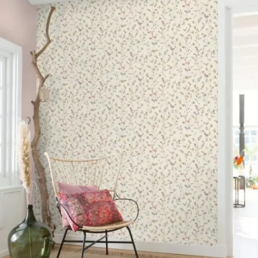 Elegancka w stylu boho tapeta z drobnych kwiatuszków w pastelowych odcieniach różu i fioletu.