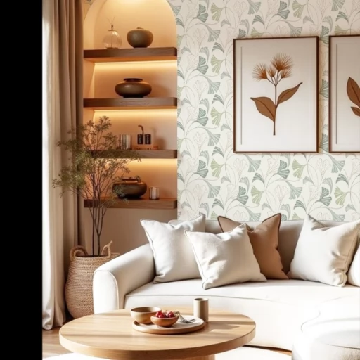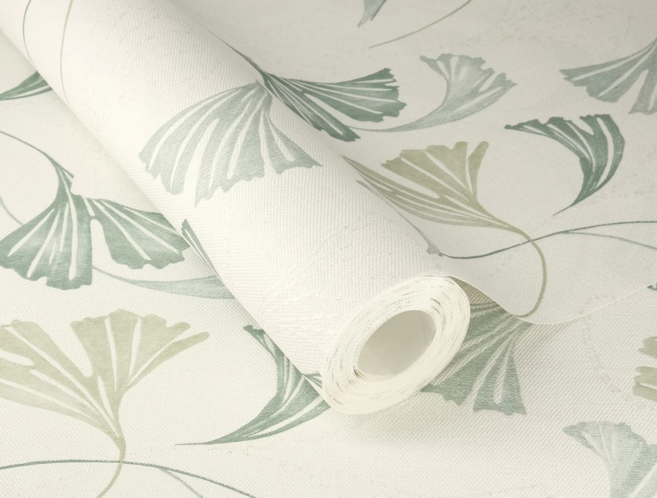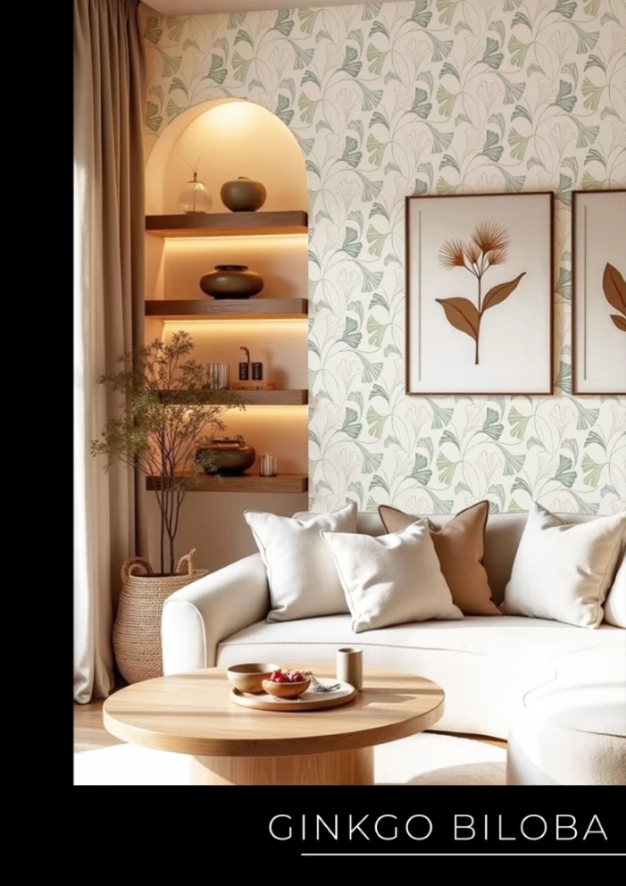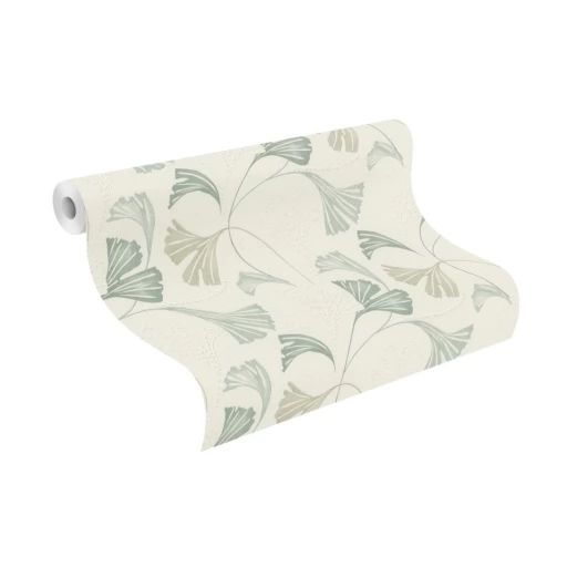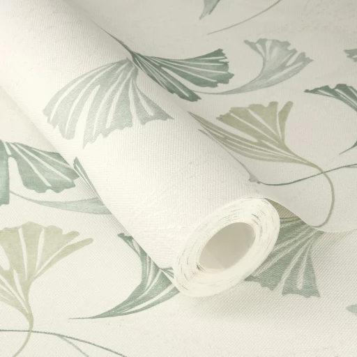 Elegancka w stylu boho tapeta z motywem liści w odcieniu szałwiowej zieleni z delikatnym dodatkiem brokatu.