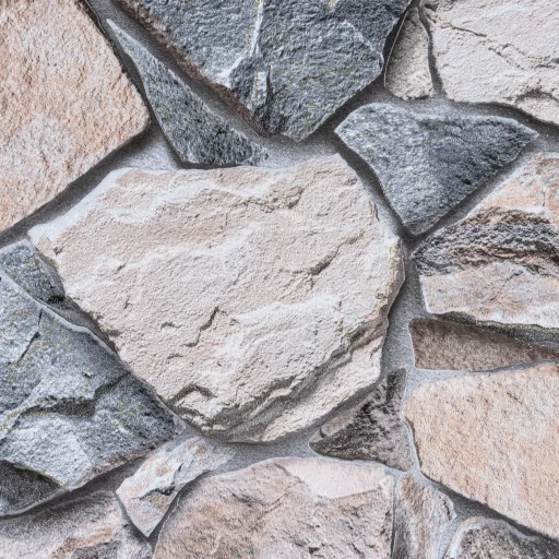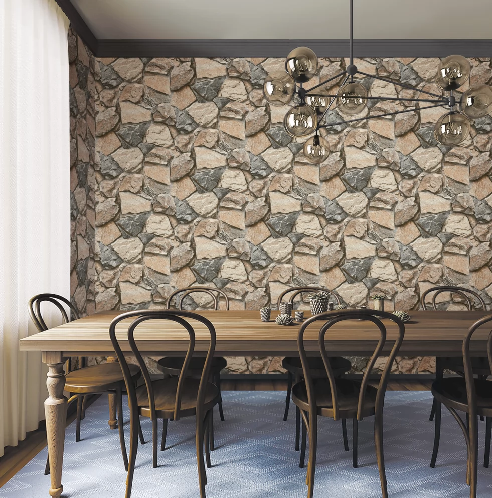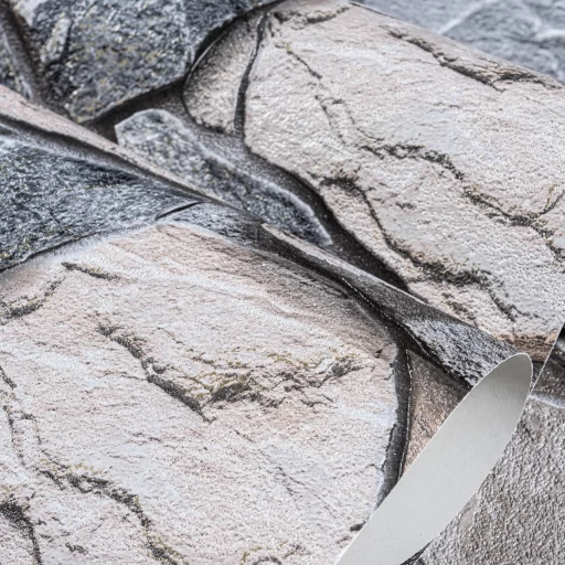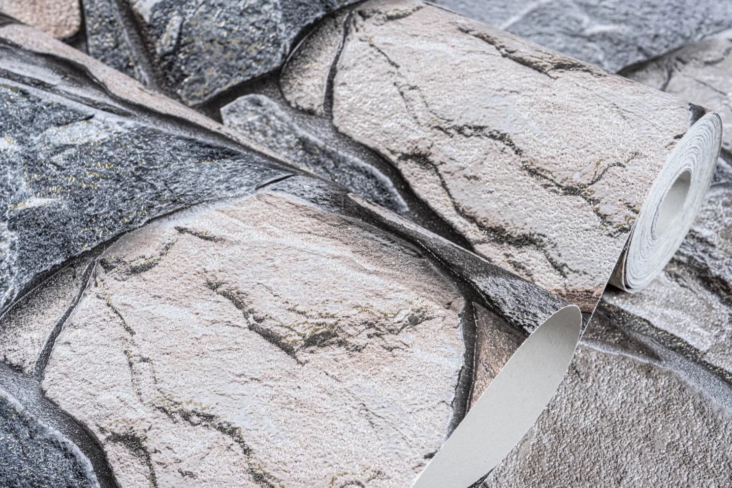 Wysokiej jakości winylowa, zmywalna tapeta. Wzór imitujący dekoracyjny kamień w odcieniach beżu i szarości z połyskującymi elementami. Struktura tapety odzwierciedla ułożenie wzoru.
