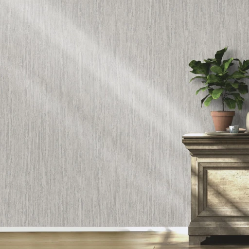 Tapeta przedstawiająca wzór pionowych prążków w kolorze szarym. Tapeta winylowa na flizelinie.