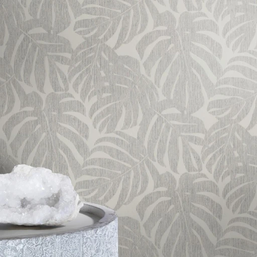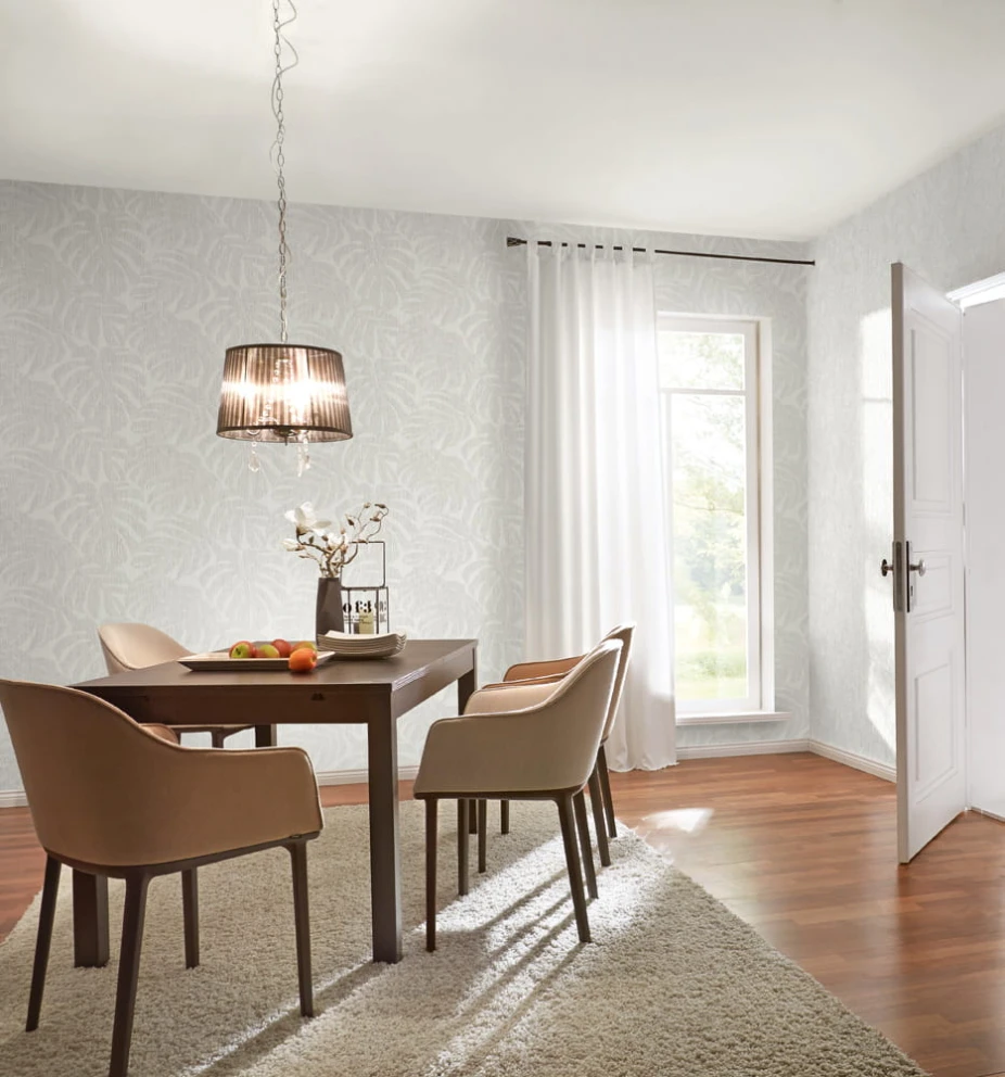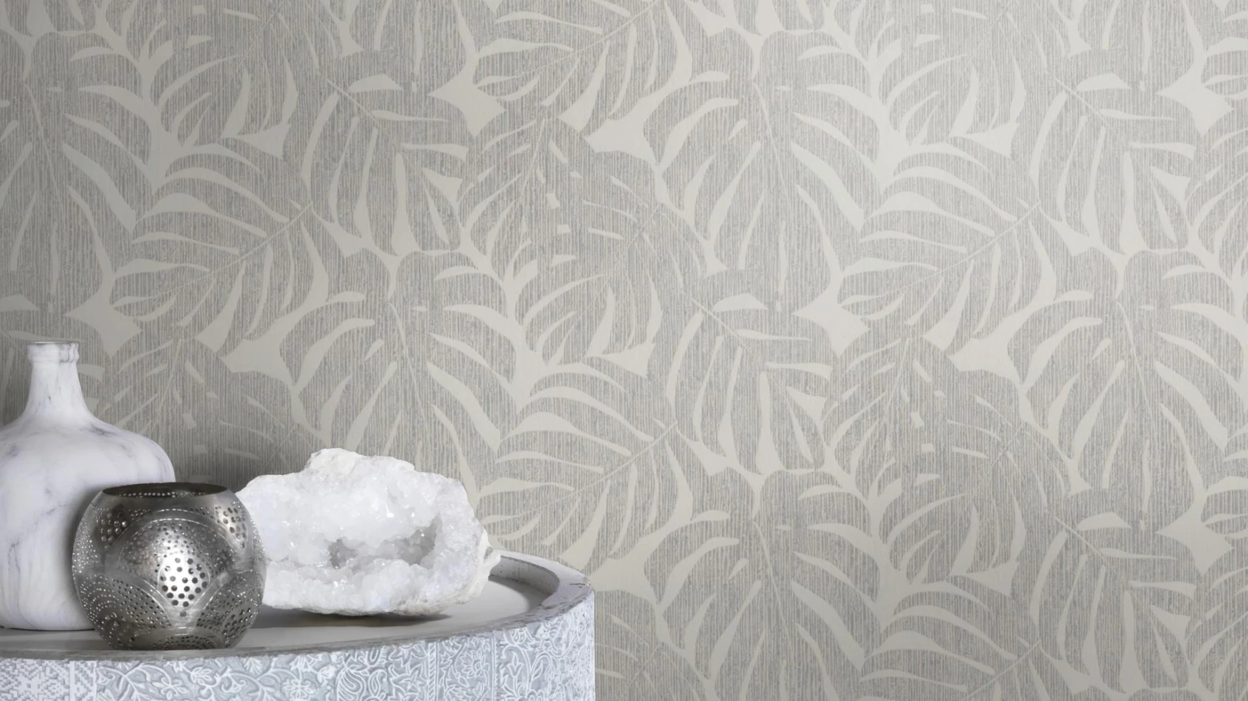 Tapeta przedstawiająca wzór eleganckich liści monstery w szarym kolorze. Tapeta winylowa na flizelinie.