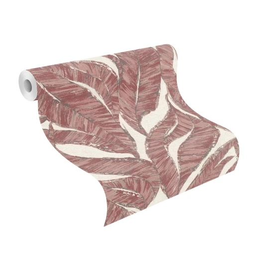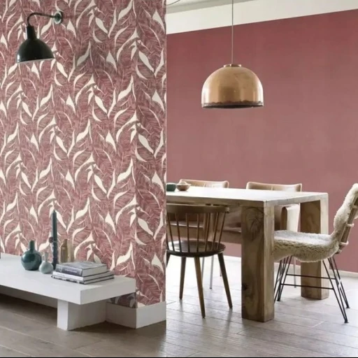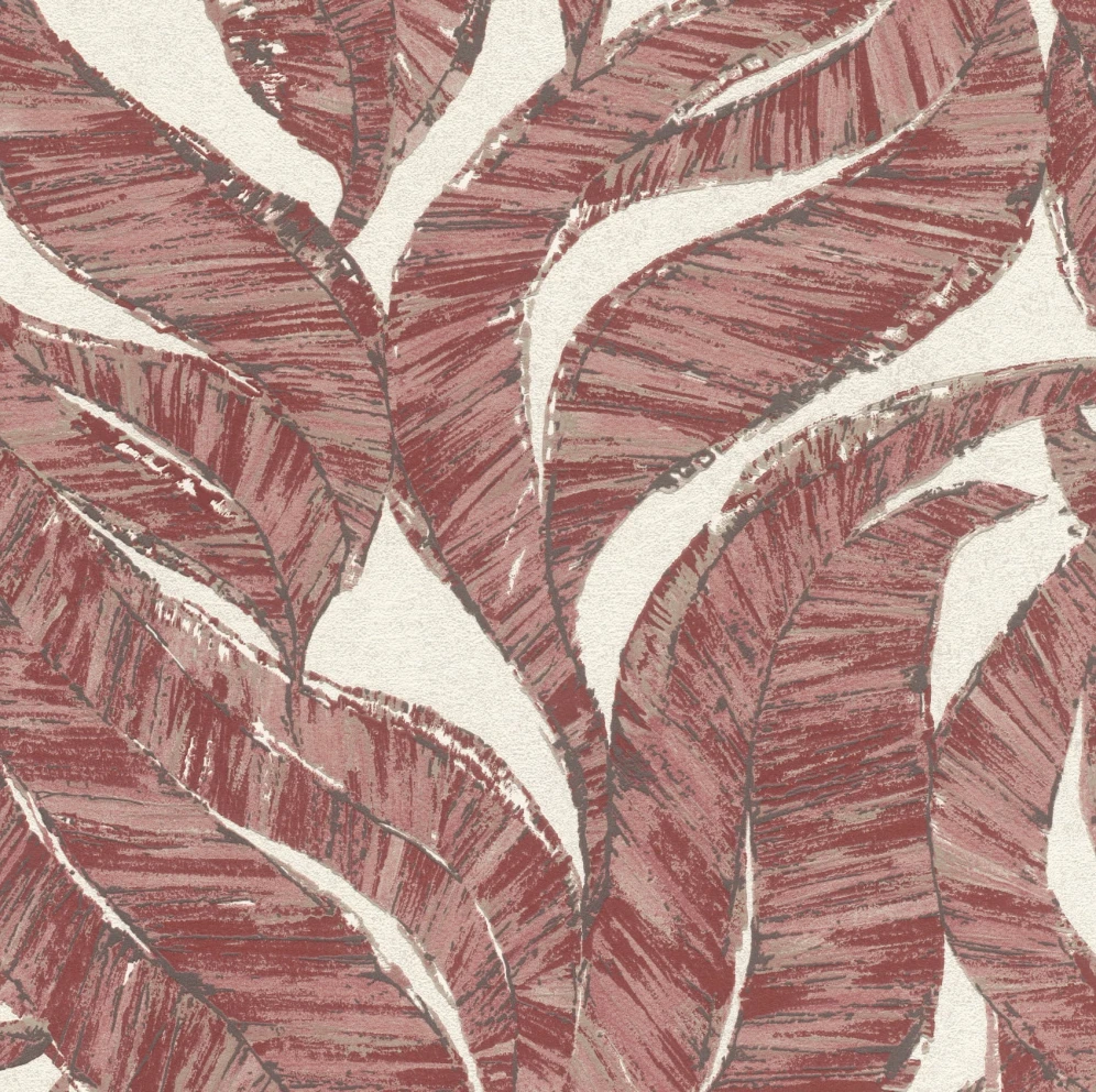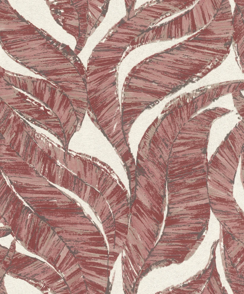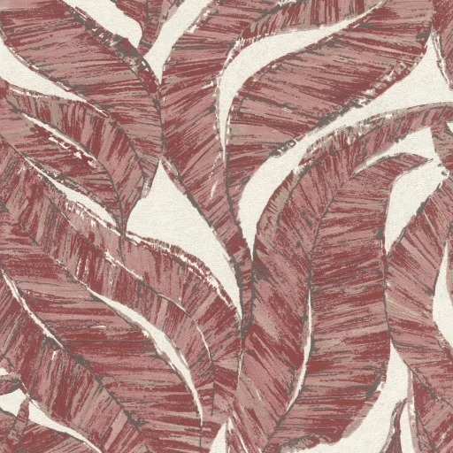Motyw roślinny z gęsto naniesionymi liśćmi pokrywającymi całą powierzchnię tapety. Tak gęsto nadrukowany wzór powoduje, że nie rzuca się w oczy jego powtarzalność. Tapeta utrzymana w całości w tonacji bordo beży i wykończona w matowy sposób połączony z bardzo delikatną strukturą.