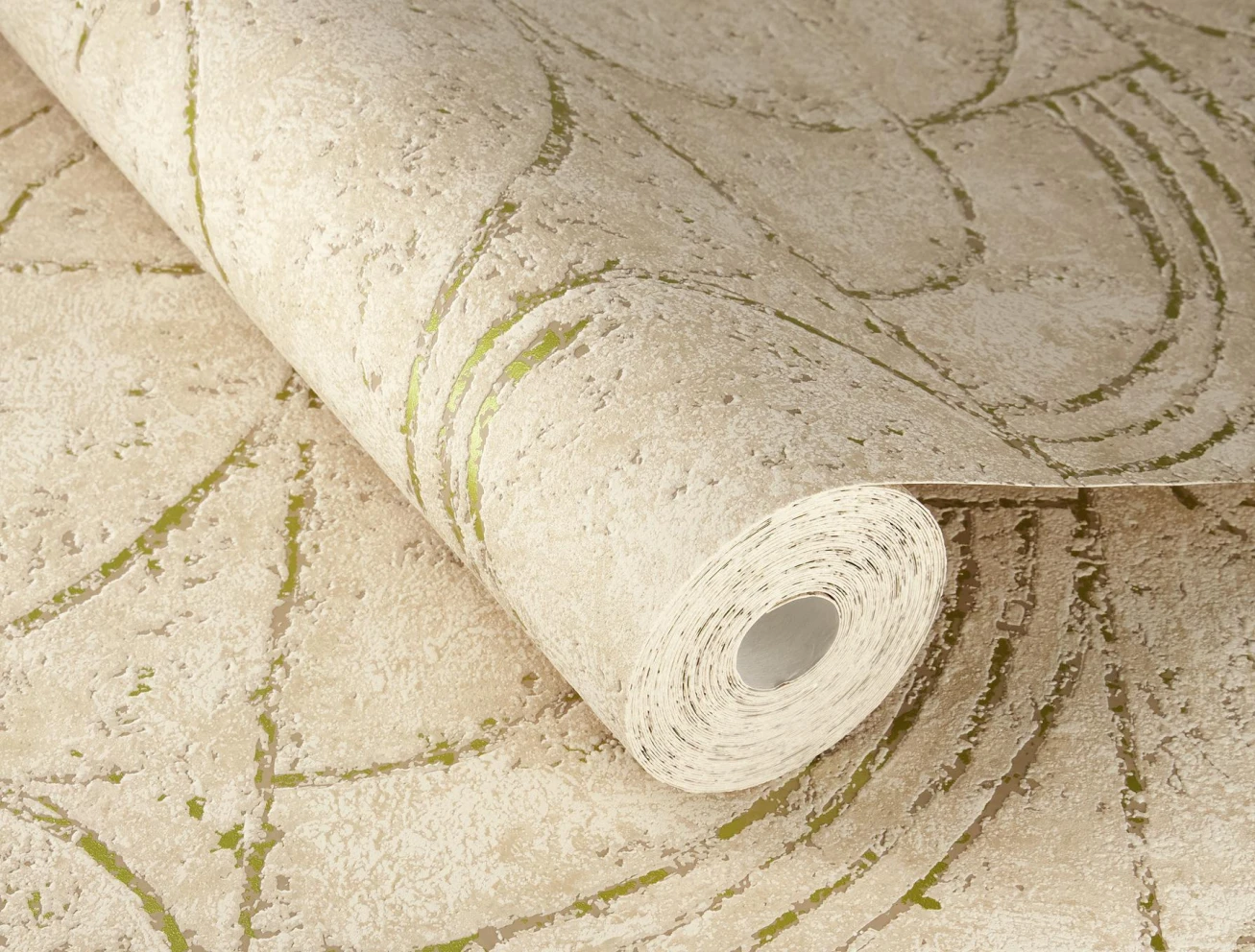 Tapeta przedstawiająca geometryczny wzór z efektem 3D w kolorze beżu i złota. Tapeta winylowa na flizelinie. Tapeta ma grubą, mięsistą strukturę, przez co idealnie nadaje się do zamaskowania nierówności i pęknięć na ścianie.