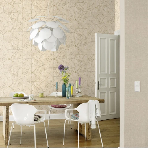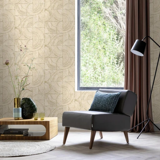 Tapetę 653632 GEOMETRYCZNA BEŻOWA ZŁOTA znajdziesz w kategoriach: geometryczne, do salonu sypialni jadalni, do kuchni i łazienki, do przedpokoju, winylowe na flizelinie, winylowe zmywalne, do sypialni, ,