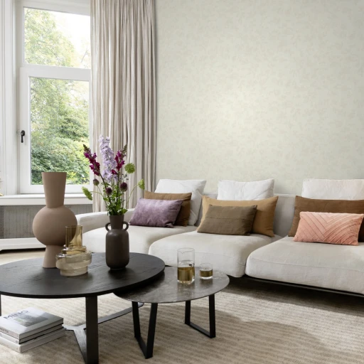Tapeta przedstawiająca wzór drobnych kwiatków w stylu boho w kolorze beżu i kremu. Tapeta winylowa na flizelinie.