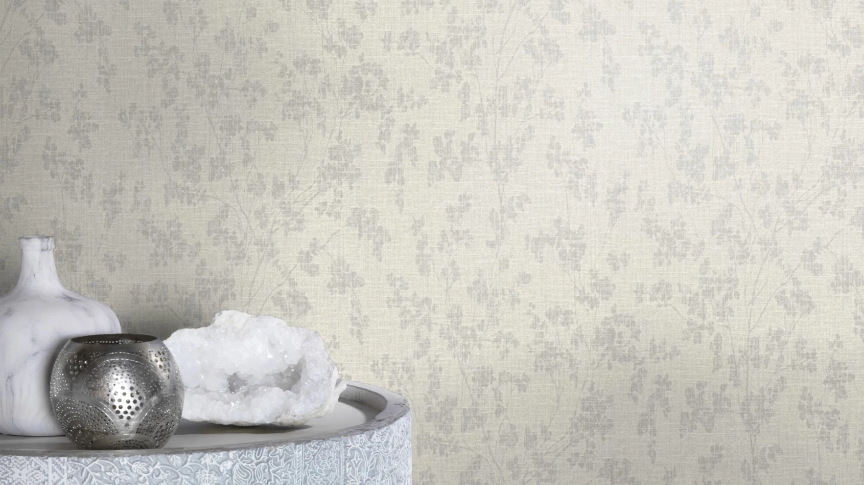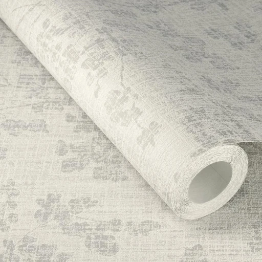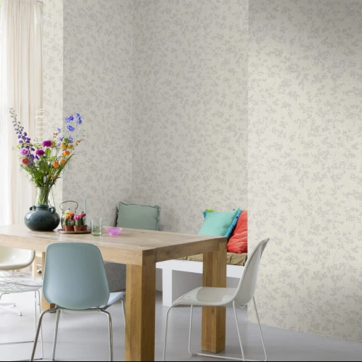 Tapeta przedstawiająca wzór drobnych kwiatków w stylu boho w kolorze szarości i srebra. Tapeta winylowa na flizelinie.