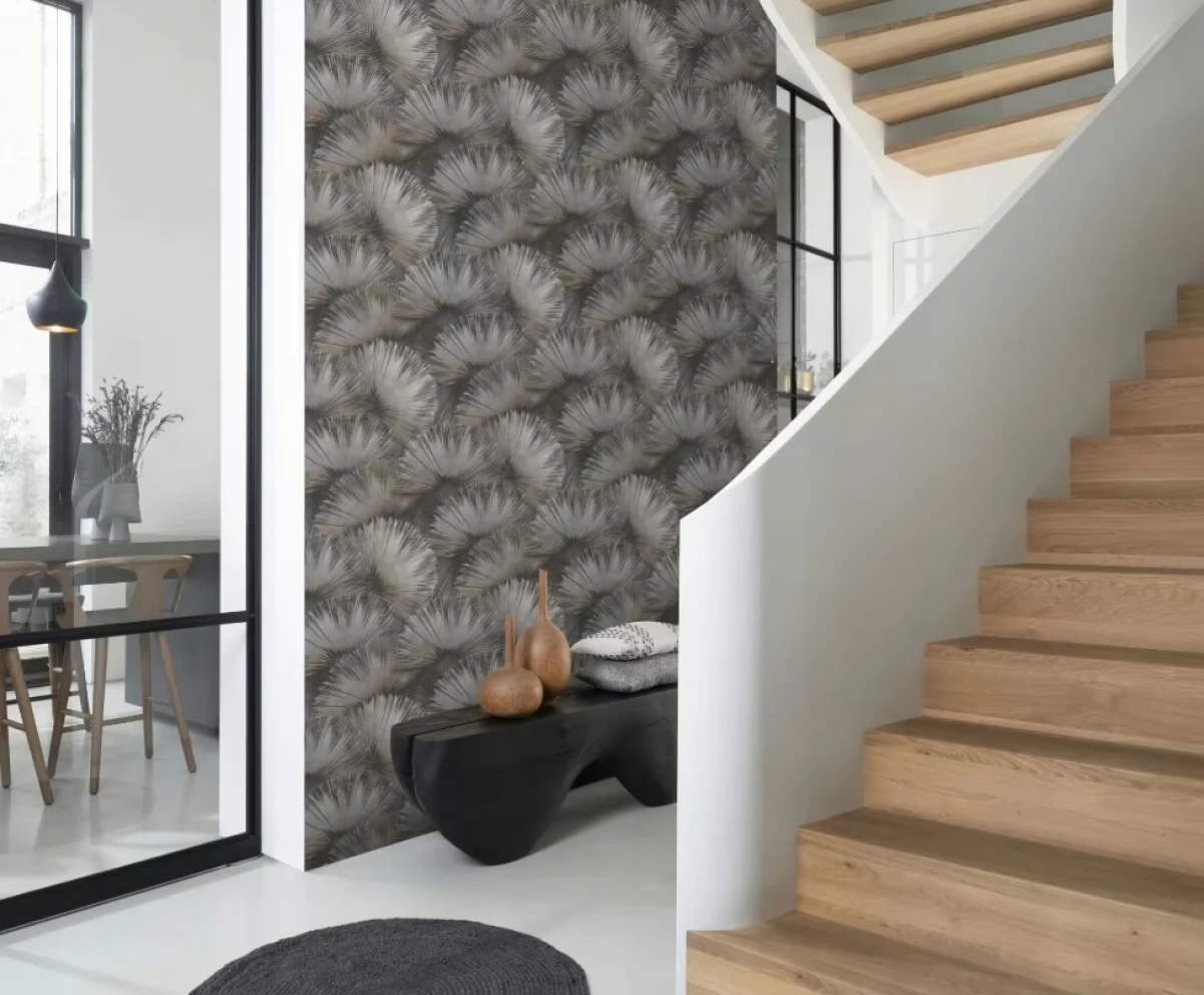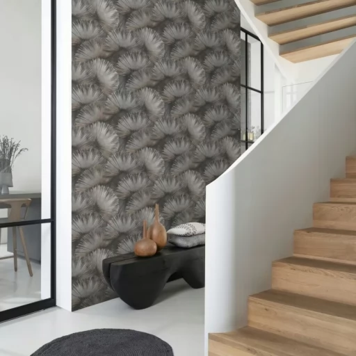 Elegancka tapeta z motywem wachlarzy w odcieniu brązu i szarości.