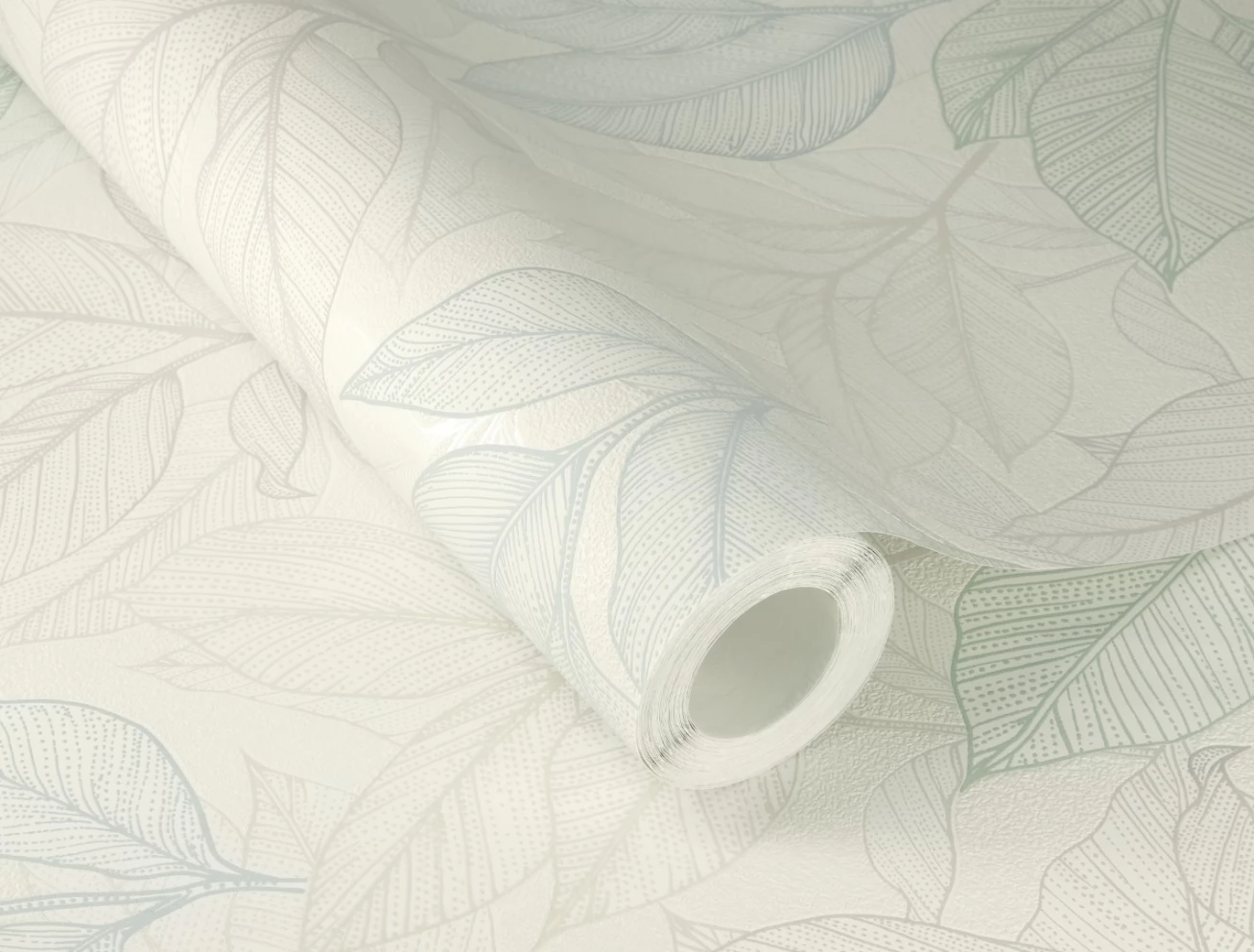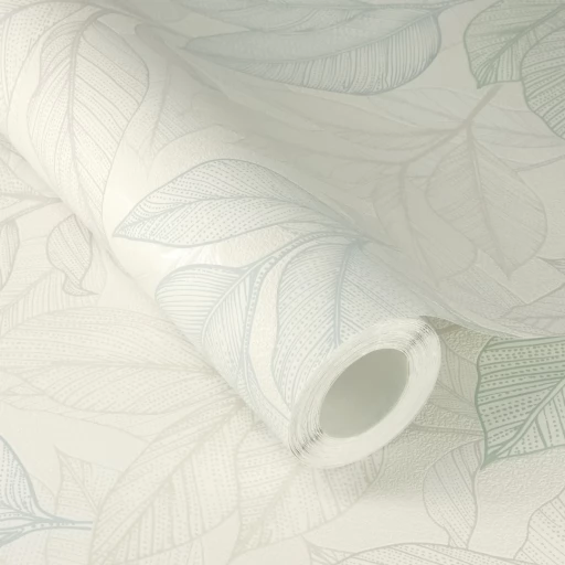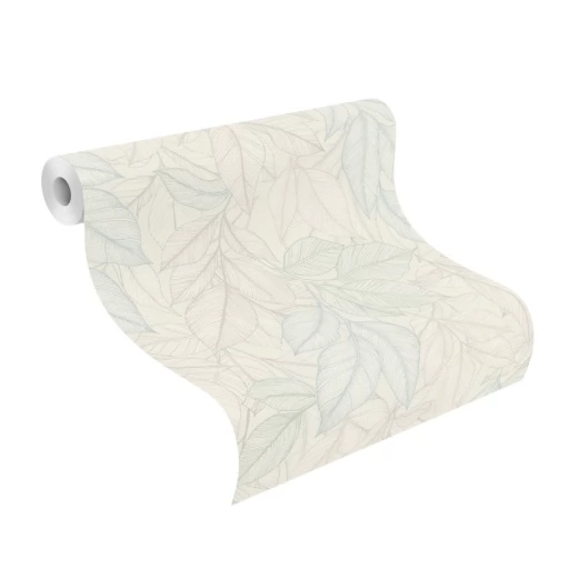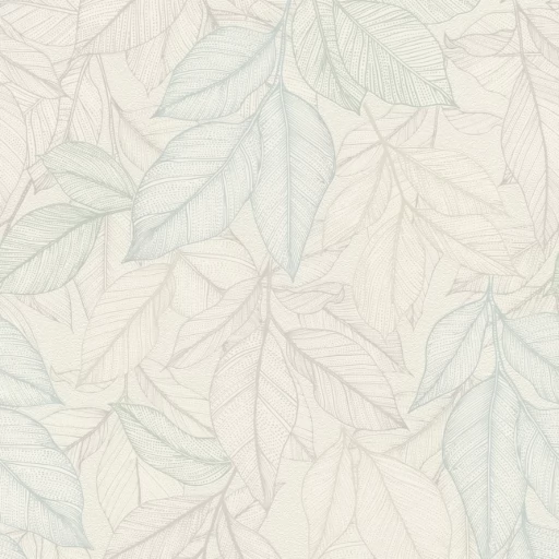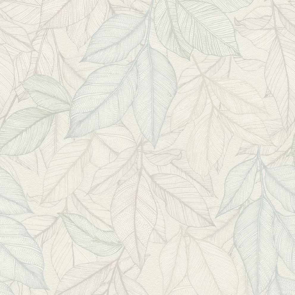 Motyw roślinny z gęsto naniesionymi liśćmi pokrywającymi całą powierzchnię tapety. Tapeta utrzymana w jasnej tonacji bieli, zieleni i błękitu z elementami lśniącej perły.