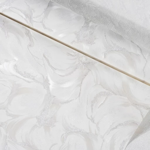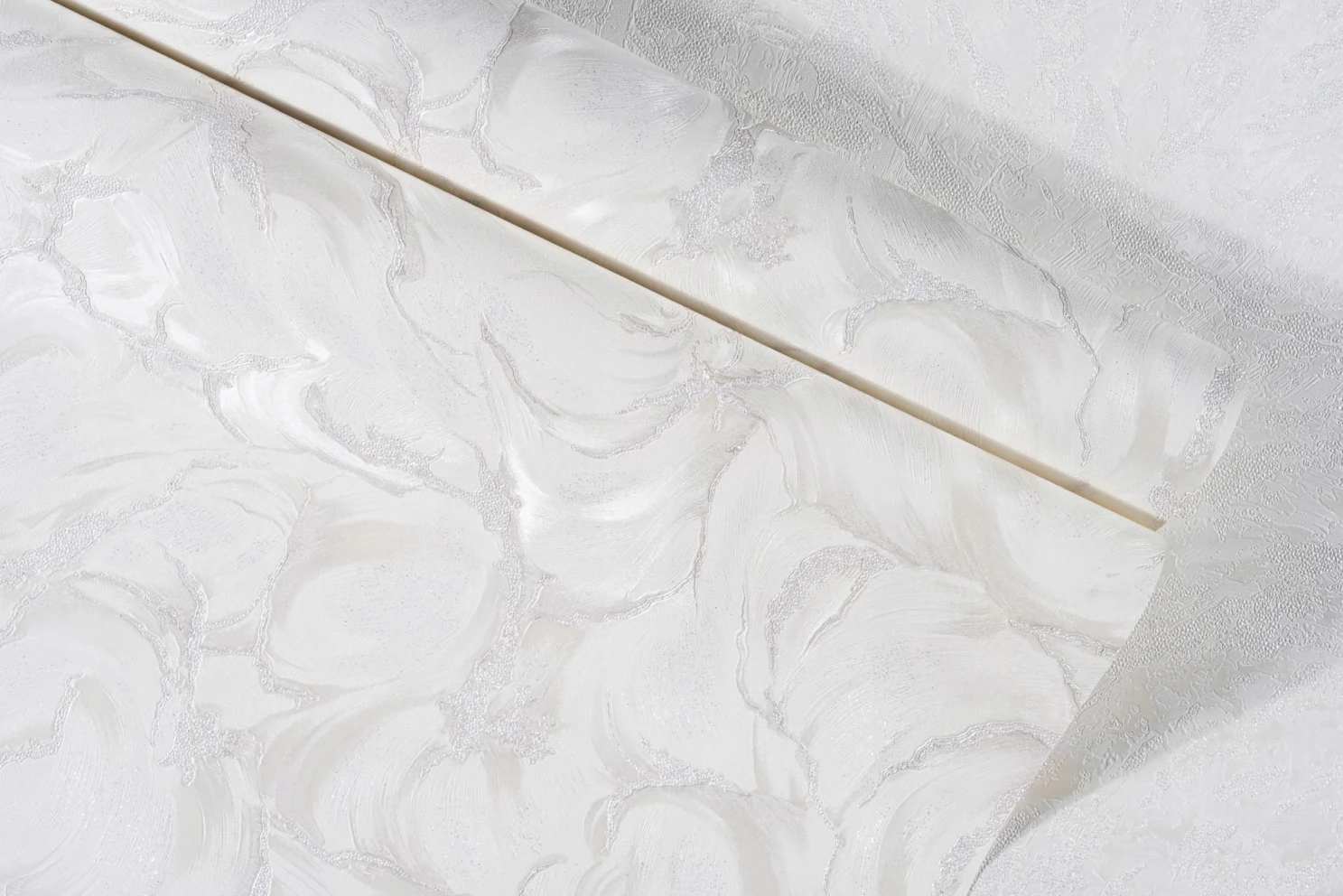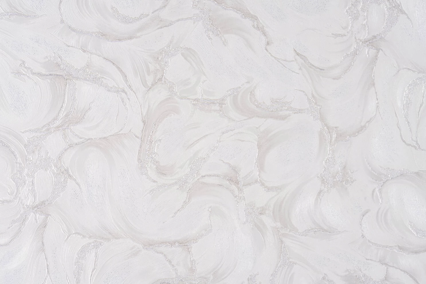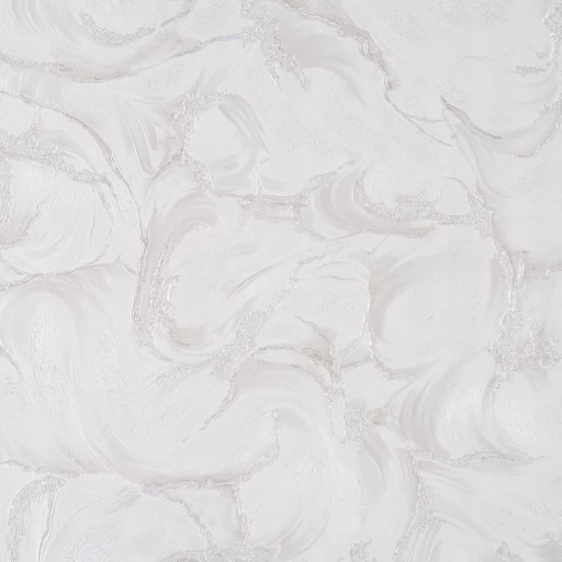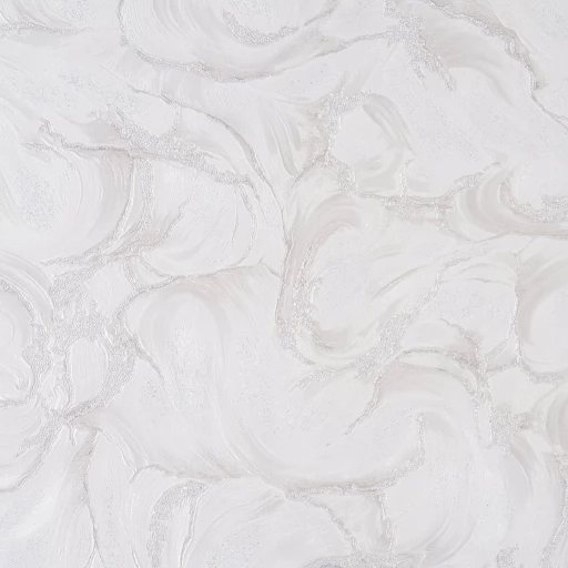 Wysokiej jakości winylowa, zmywalna tapeta. Wzór imitujący dekoracyjną strukturę przypominającą marmur w odcieniach jasnych kremów i ecru z połyskującymi przetarciami i brokatem. Struktura tapety odzwierciedla ułożenie wzoru.