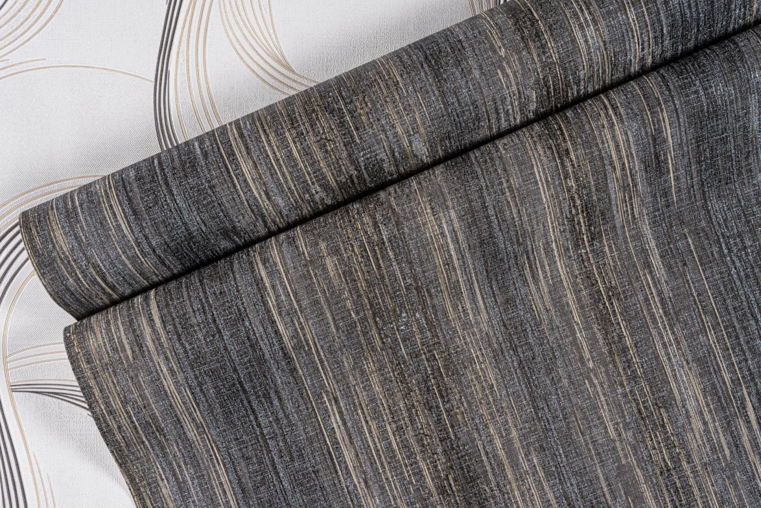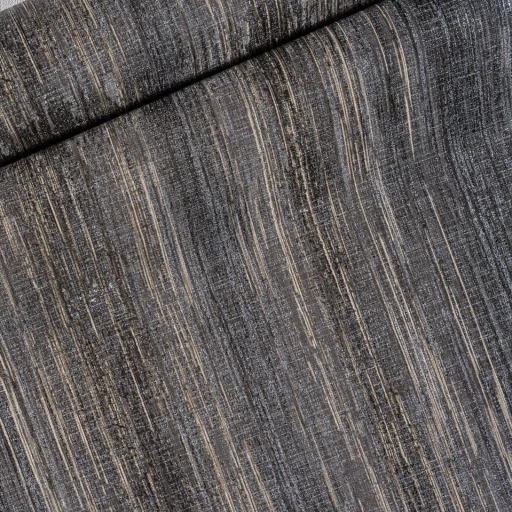 Wysokiej jakości winylowa, zmywalna tapeta. Wzór przedstawiający dekoracyjną strukturę pionowych prążków w odcieniach brązów z połyskującymi przetarciami. Struktura tapety odzwierciedla ułożenie wzoru.