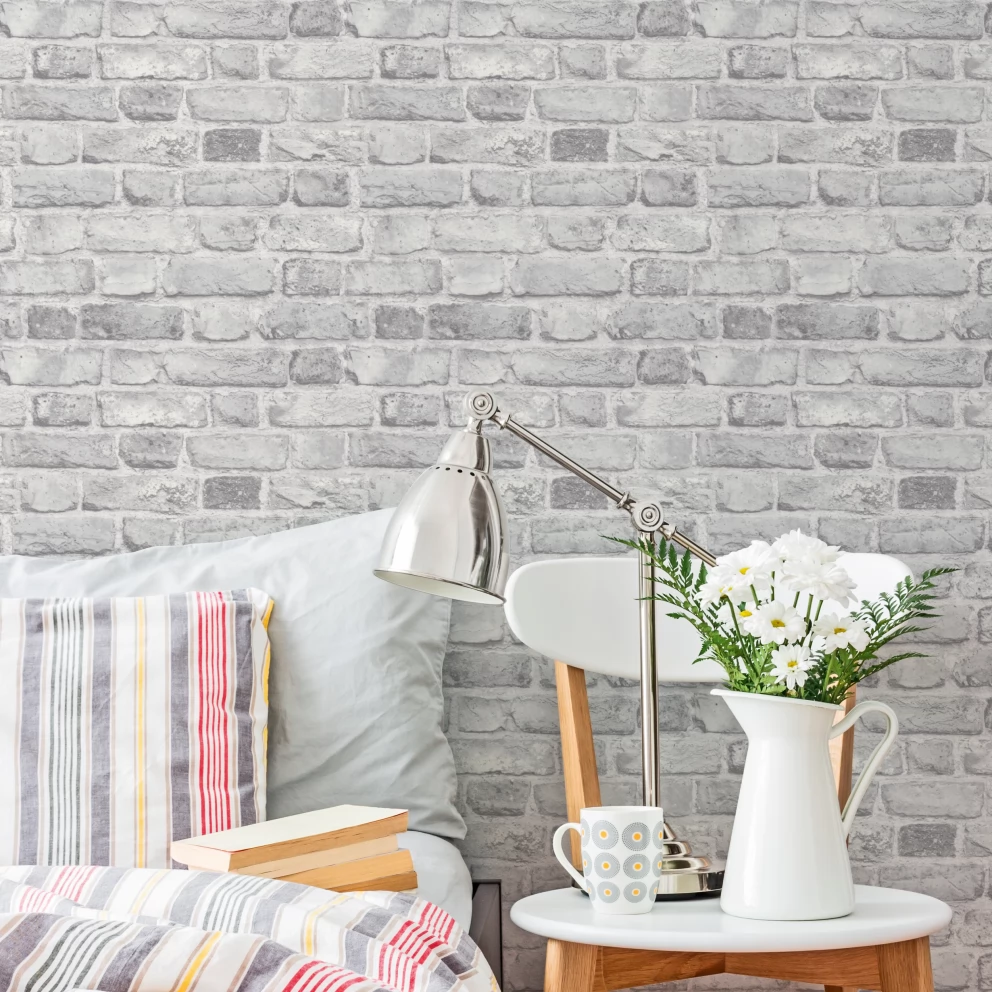 Wysokiej jakości winylowa, zmywalna tapeta. Wzór imitujący ceglany mur w odcieniu szarości. Produkt na podłożu flizelinowym - łatwy montaż ( klejem smarujemy tylko ścianę).