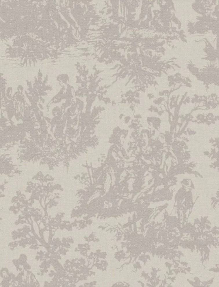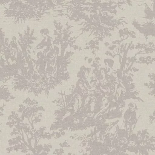 Tło tapety jest matowe i przypomina płótno w kolorze beżowym, nadruk jest w kolorze taupe i ukazuje ludzi przy różnych pracach.