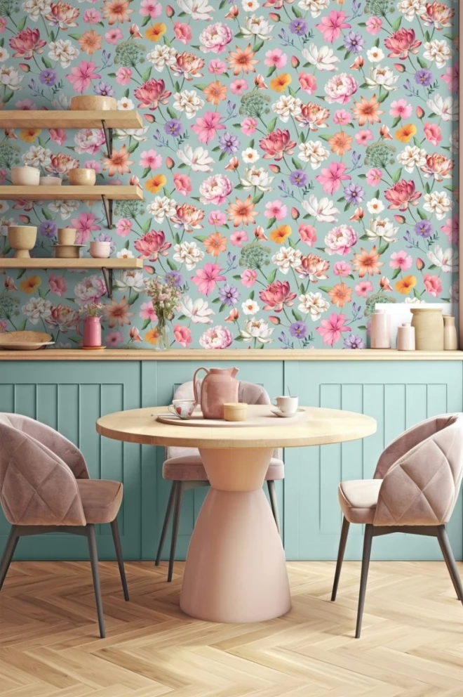 Tapetę M88801 KWIATY KOLOROWE BŁĘKIT znajdziesz w kategoriach: do salonu sypialni jadalni, do kuchni i łazienki, do przedpokoju, winylowe na flizelinie, winylowe zmywalne, roślinno kwiatowe, do sypialni, ,