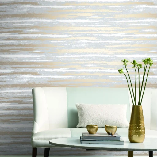 Ekskluzywna tapeta ścienna amerykańskiego producenta YORK z kolekcji MODERN METALS ANTONINA VELLA. Wzór zwany ATMOSPHERE to odważne, poziome pociągnięcia pędzla. Ta ciekawa malarska faktura w odcieniach taupe, ecru i lśniącego złota stanowi nowoczesną dekorację przypominającą odręcznie wykonane dzieło sztuki. Załączona aranżacja zdecydowanie lepiej oddaje rzeczywisty wygląd tapety.